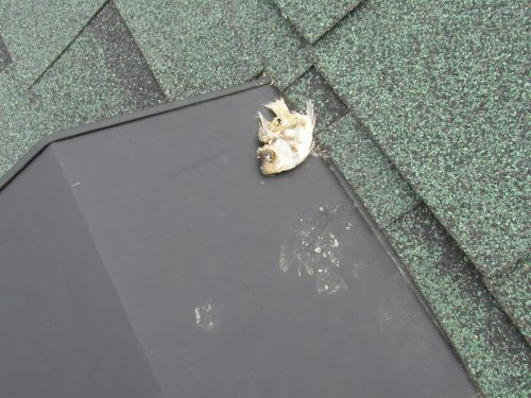 How did this fish get on a roof? We're guessing a bird dropped it. Yes, there was a lake nearby.