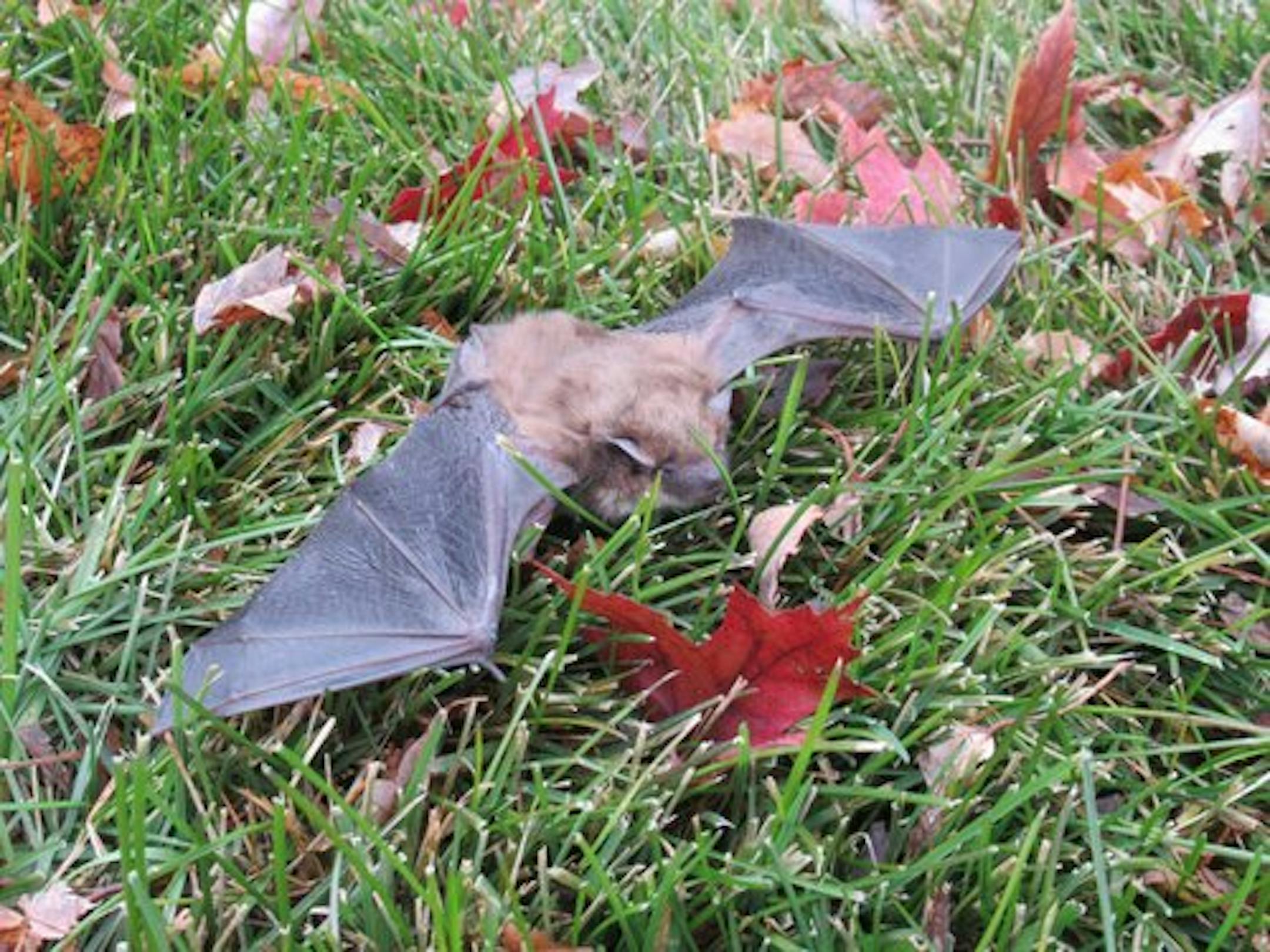 We have plenty of photos of bats at soffits and in attics, but that’s typical. This is a bat in an unusual spot; it’s just sitting on the grass.