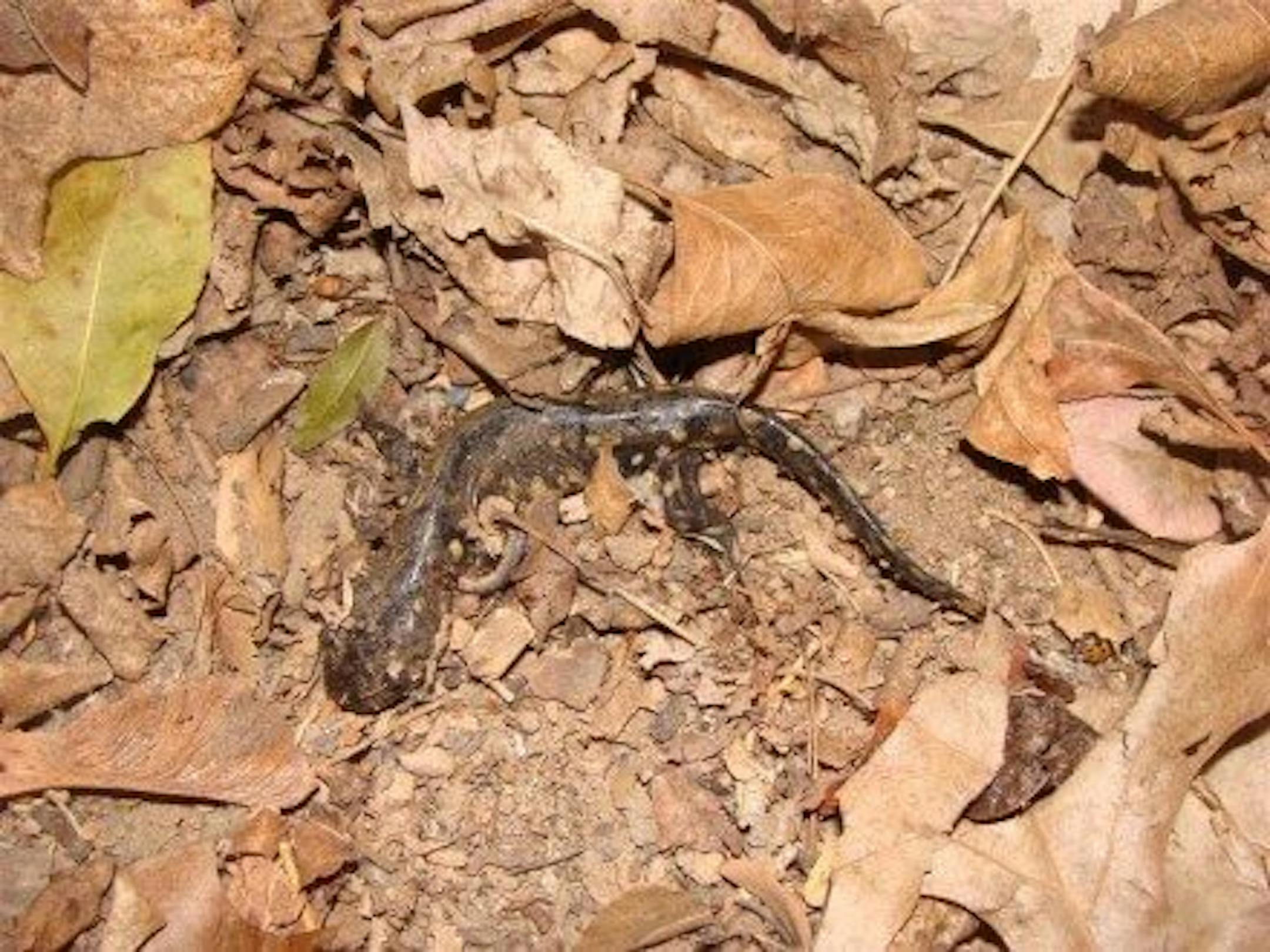 Spotted Salamander trapped in a window well. Yes, we rescued him. I think. This was many years ago.