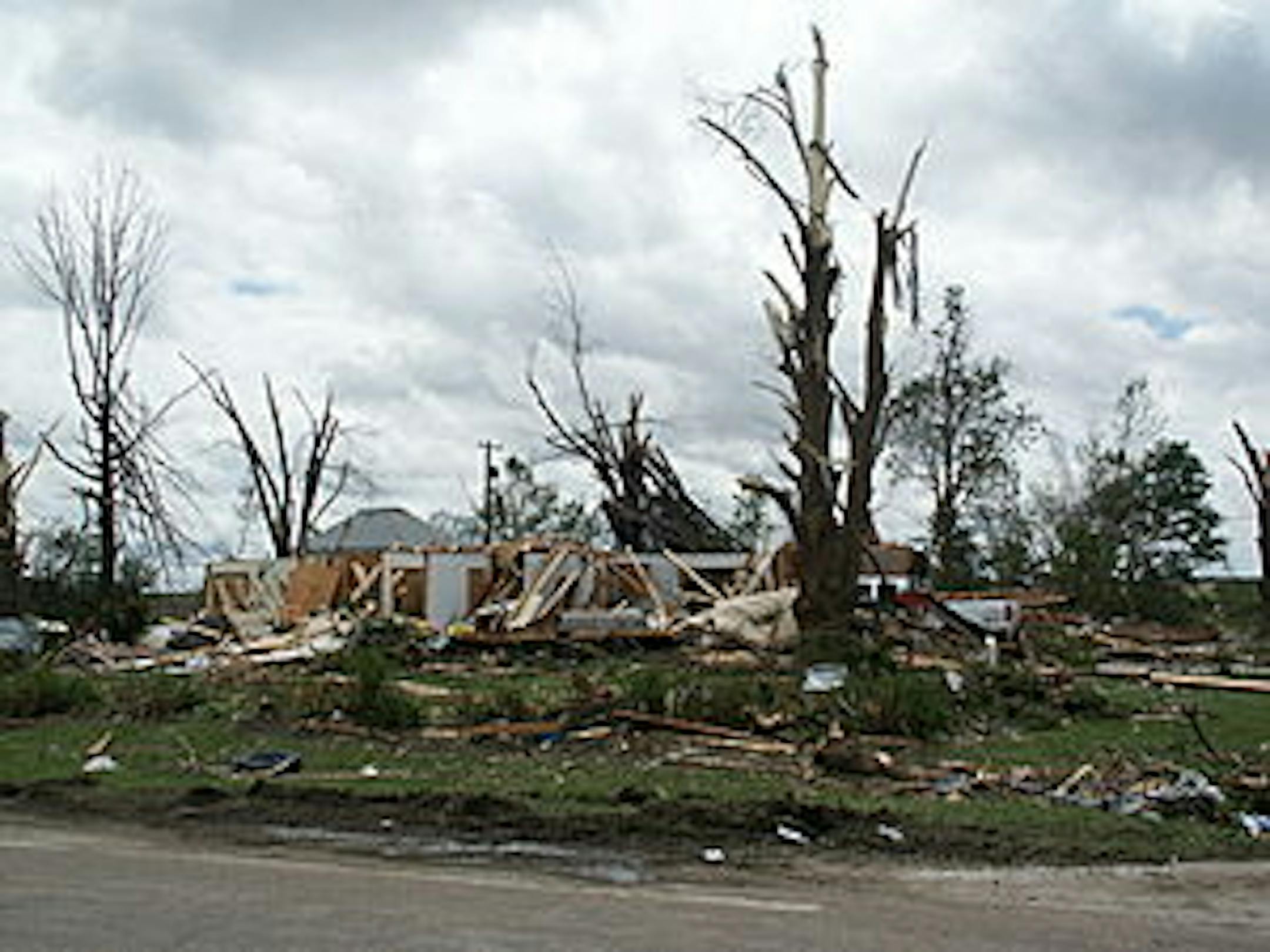 A destroyed home and trees with all their limbs gone in Hallam, Neb.,after the 2004 tornado tore through. (Photo from the Omaha/Valley, Neb., officeof the National Weather Service)After slamming Hallam, the width of the tornado lessened to about a mile wide.