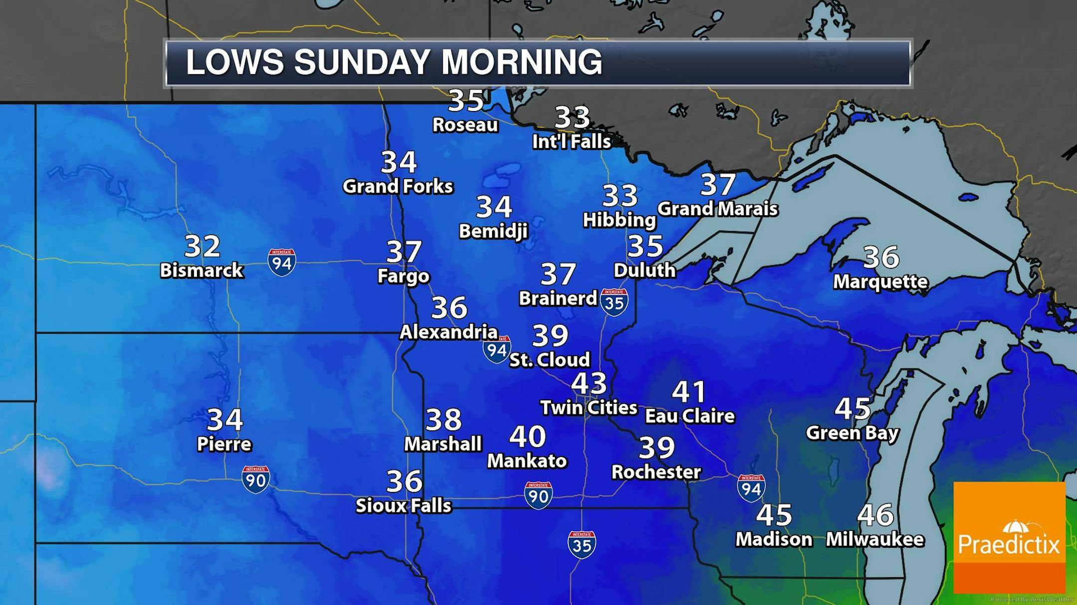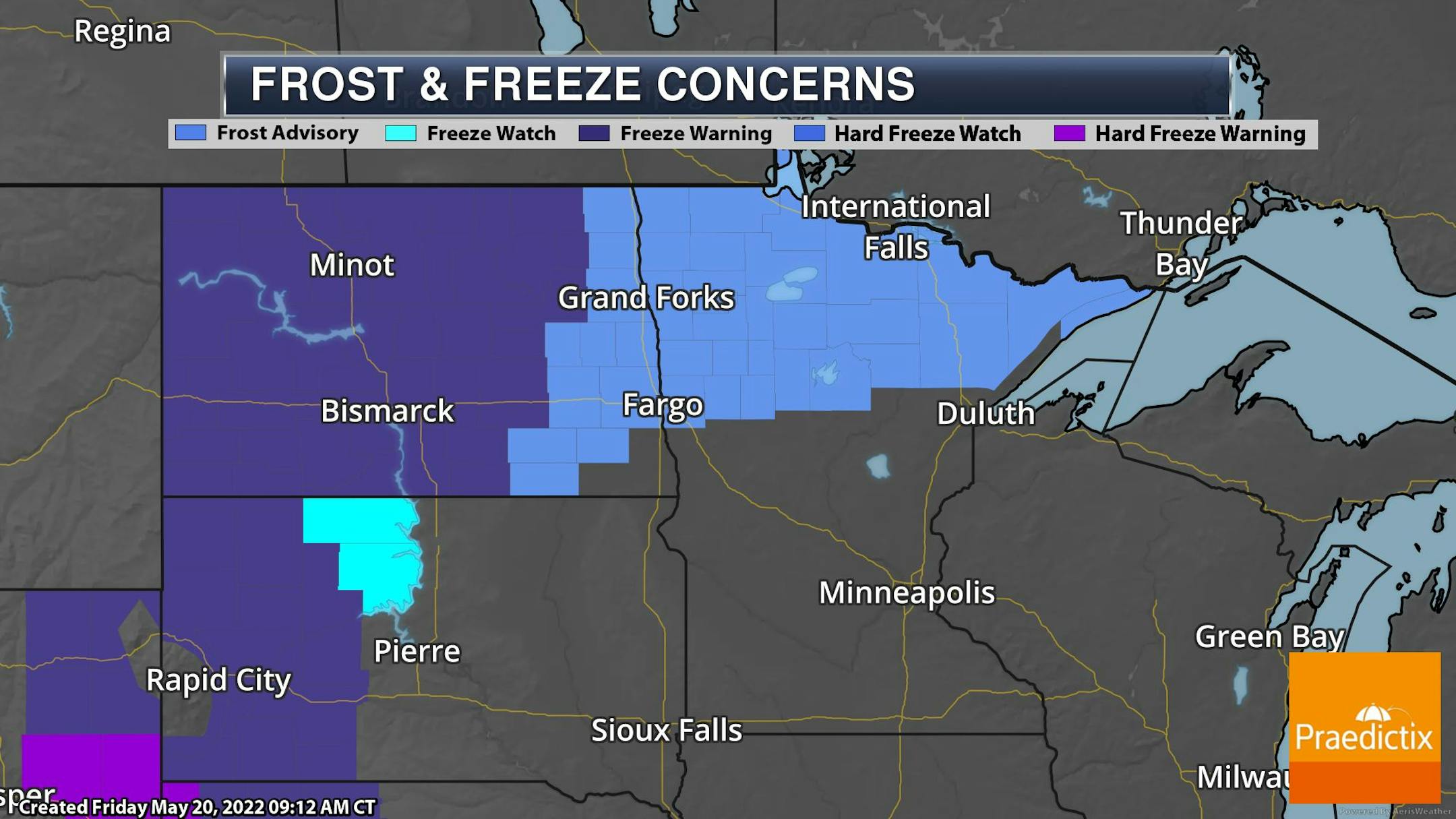 Frost and freeze concerns are in place this weekend as low temperatures both Saturday and Sunday morning could dip into the 20s and low 30s from the Dakotas to northern Minnesota.