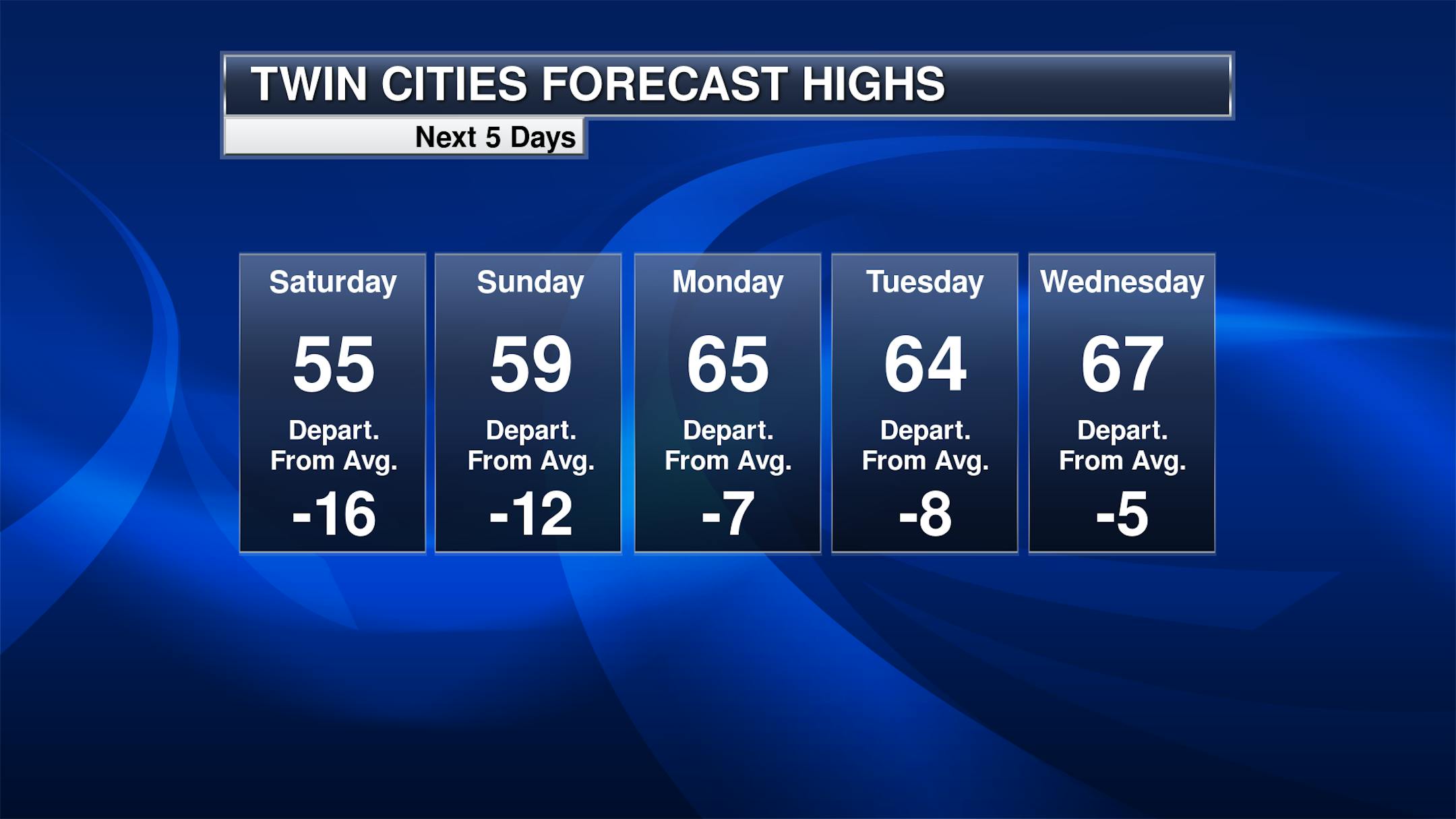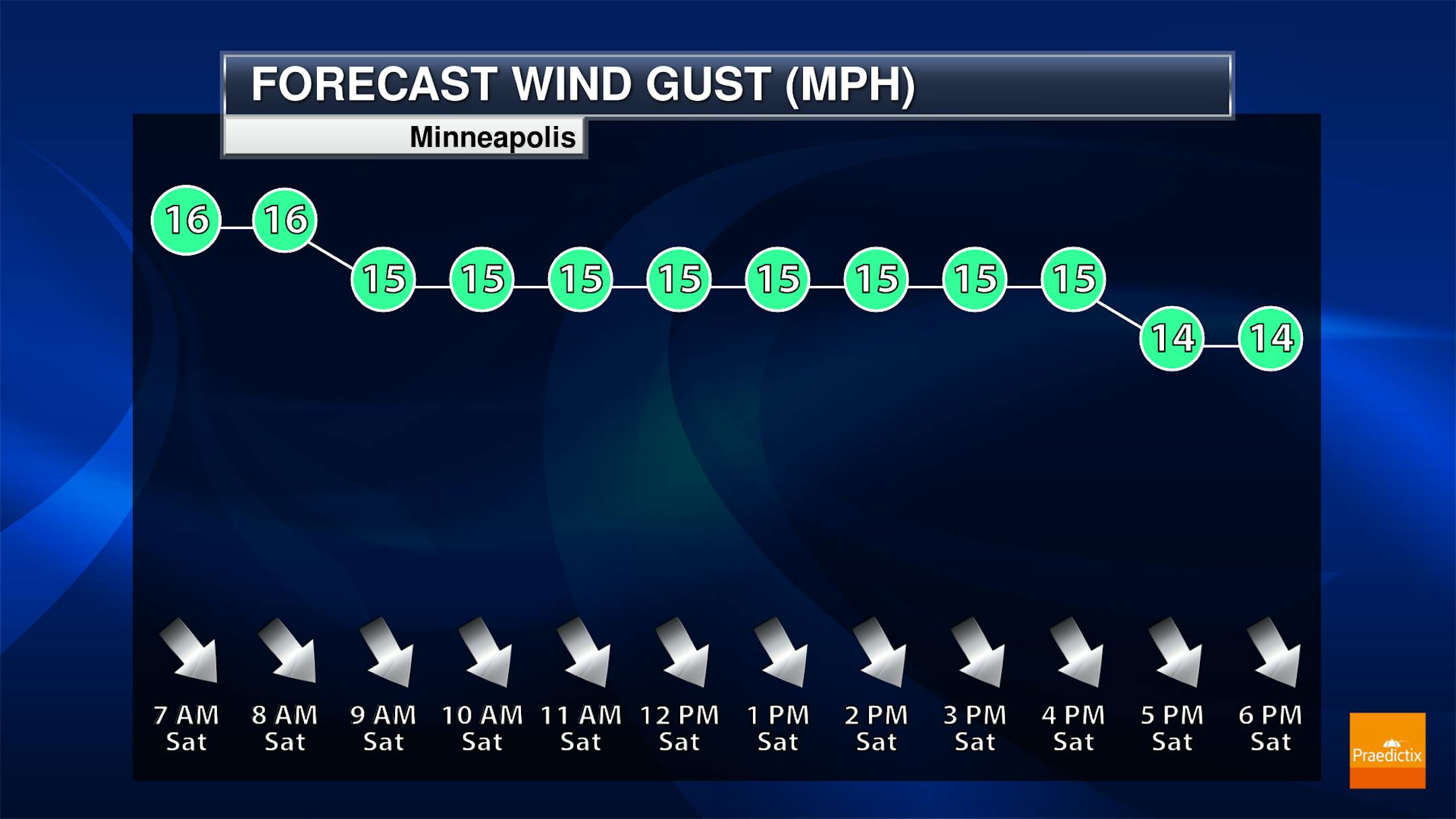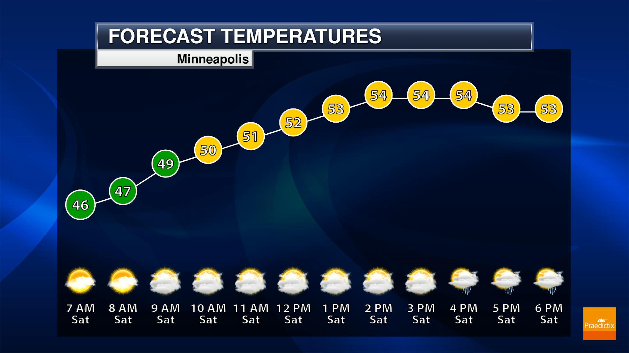 The hourly temps for Minneapolis on Saturday shows temperature starting in the mid 40s in the morning and warming in mid 50s by the afternoon. There is a slight chance of a few showers in the afternoon, but most locations will stay dry. Northwesterly winds will gusty around 15mph to 20mph.