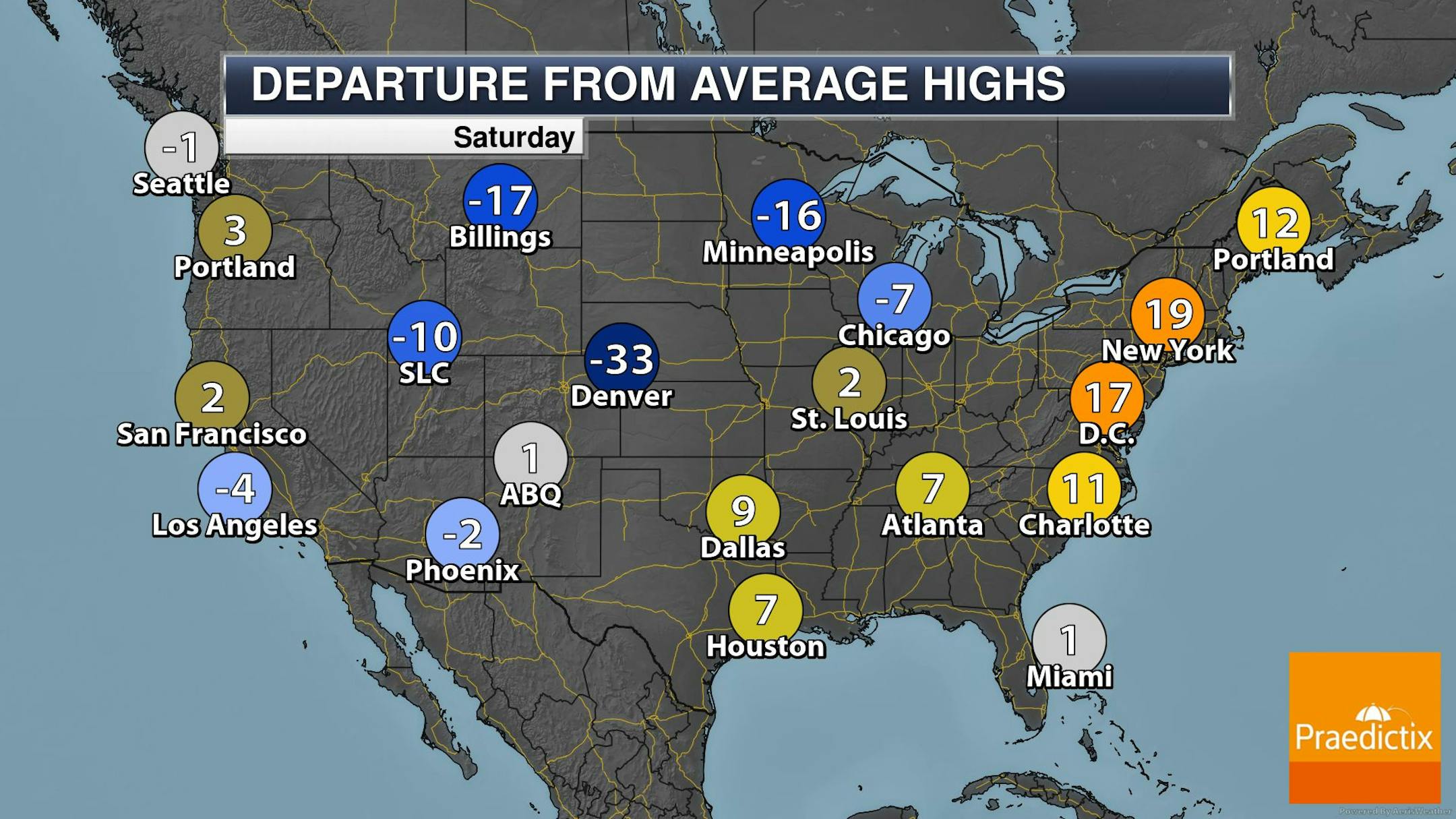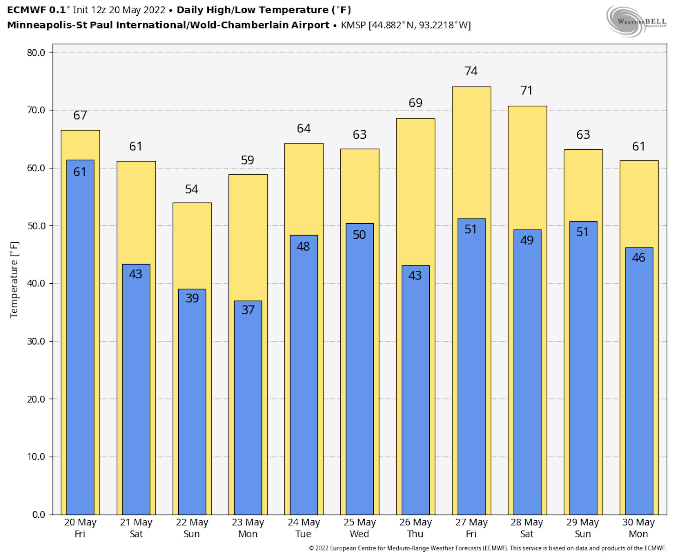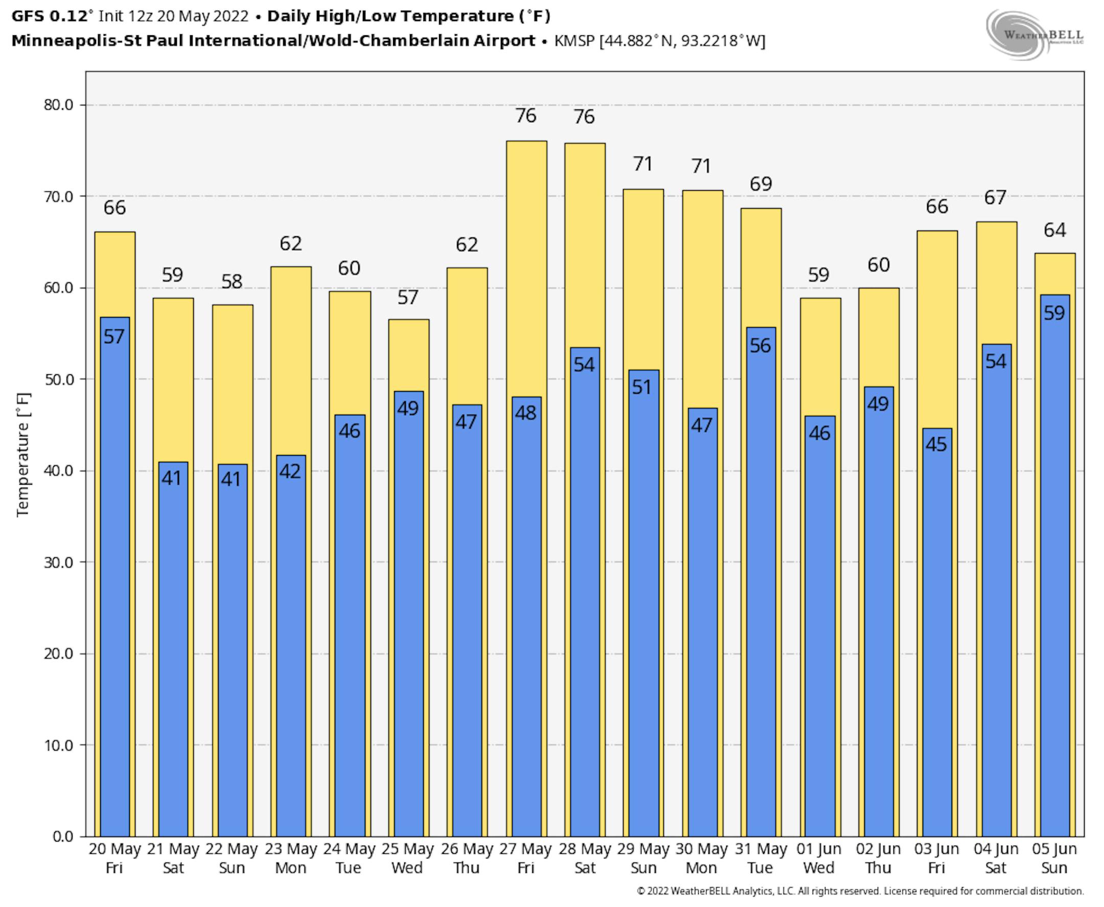 The hourly temps for Minneapolis on Saturday shows temperature starting in the mid 40s in the morning and warming in mid 50s by the afternoon. There is a slight chance of a few showers in the afternoon, but most locations will stay dry. Northwesterly winds will gusty around 15mph to 20mph.