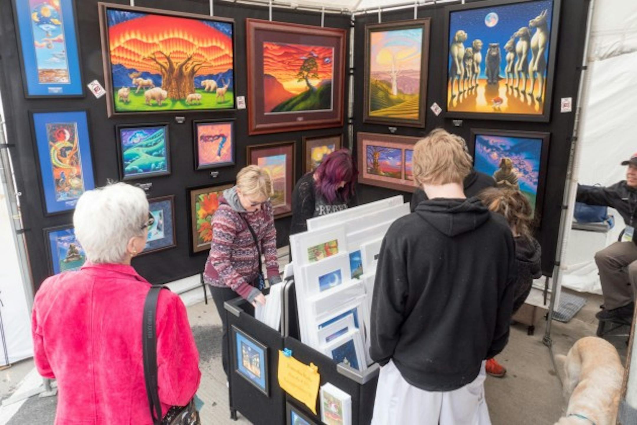 This year's juried art fair includes 40 regional artists in mediums ranging from painting to leather arts, each with their own tent, plus three youth artists. It's a drastic reduction from last year's 115 artists and eight youth artists. To help with social distancing, the event is spread out over three locations that are each about four blocks apart, triangulating the downtown area. There will also be five food trucks, offering kettle corn, Mexican, beef sandwiches, and more.