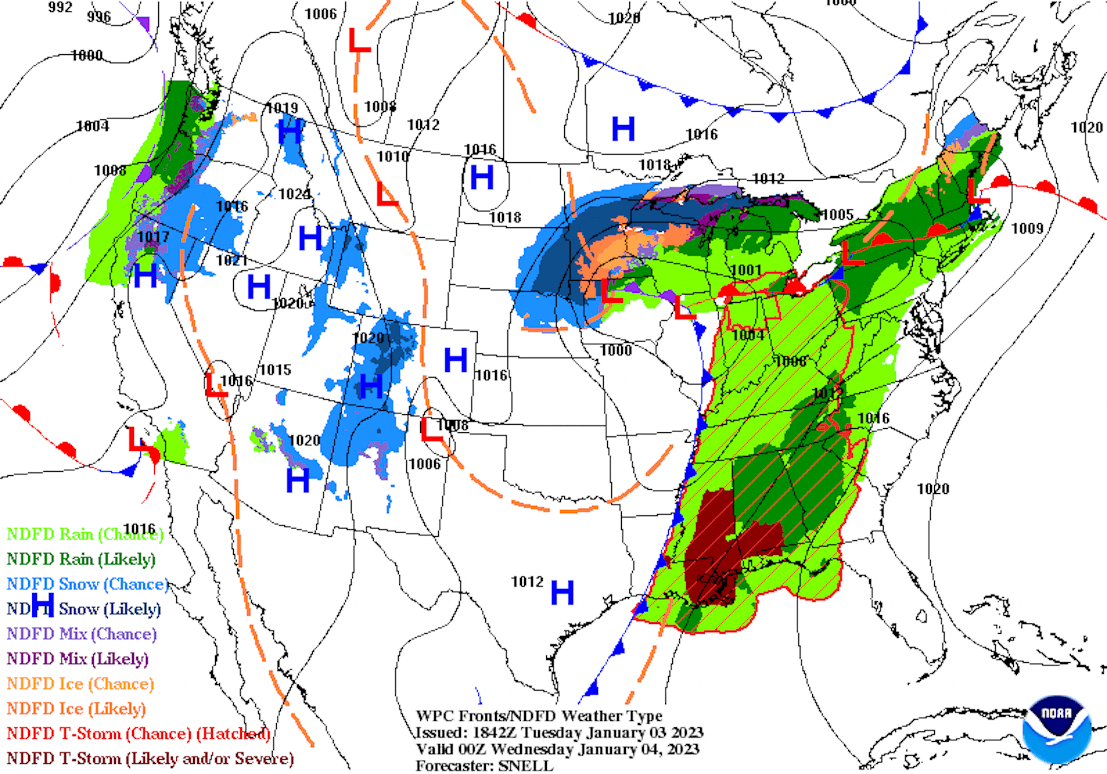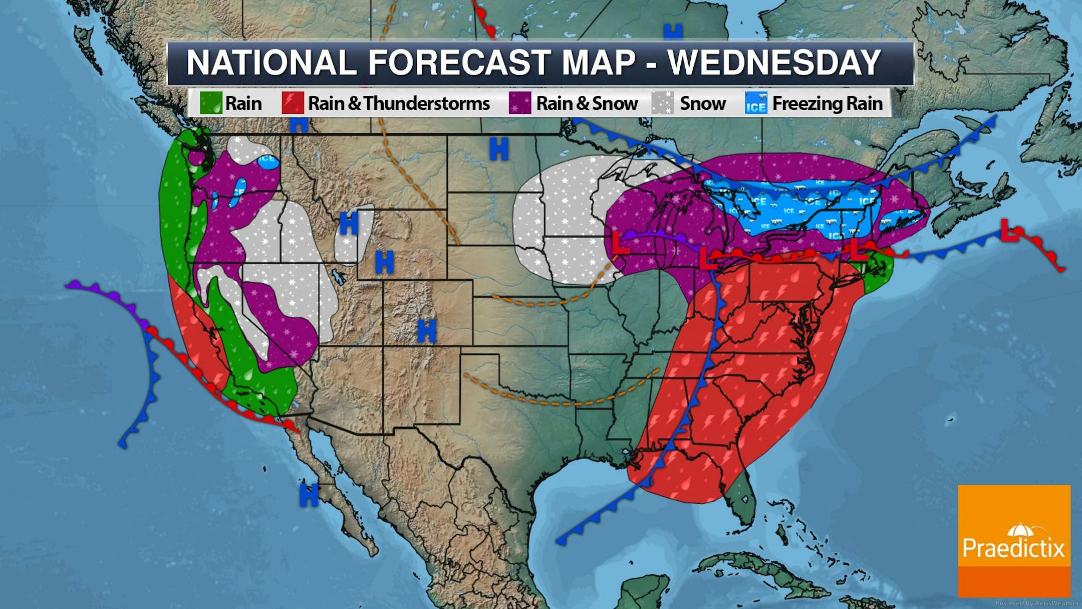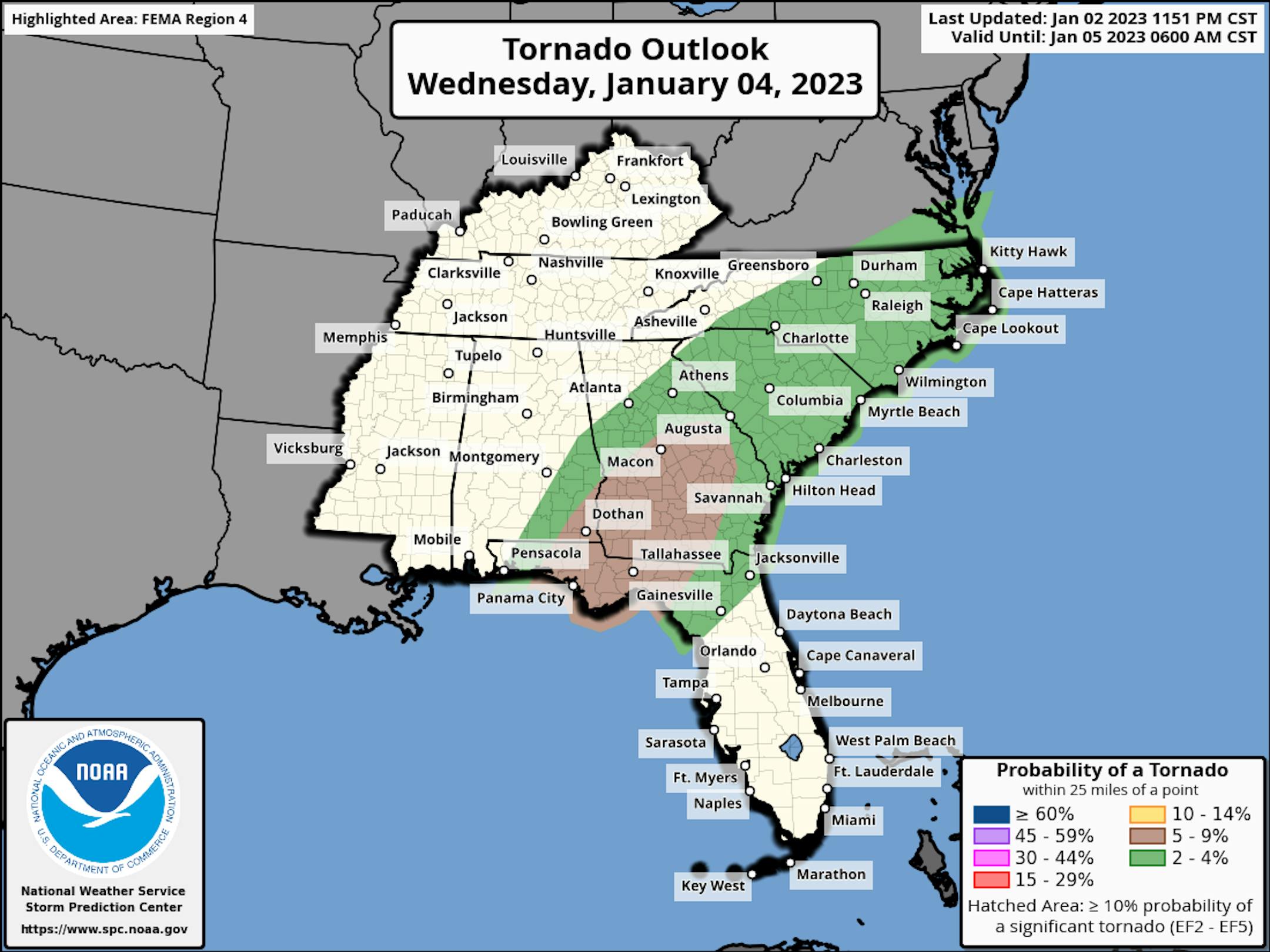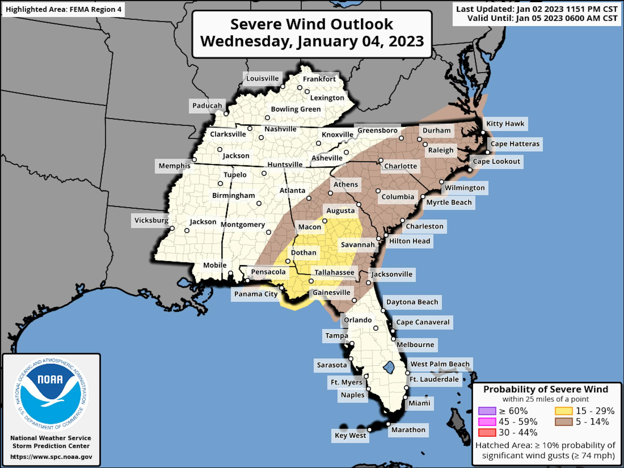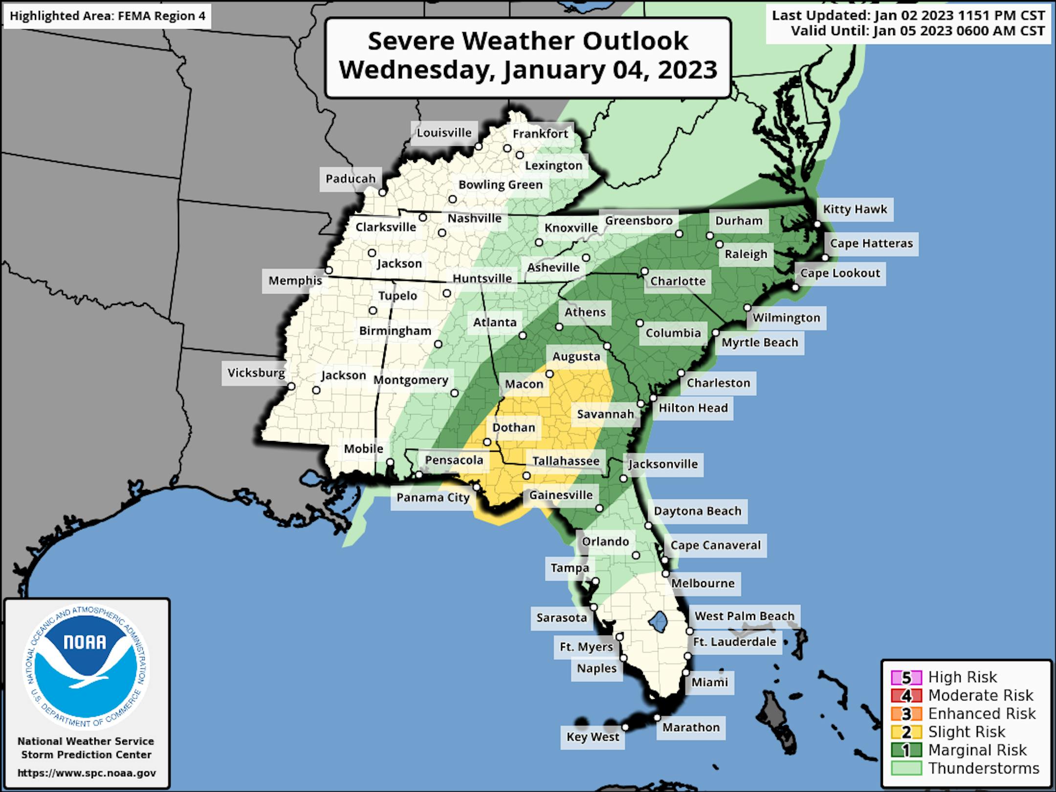 According to NOAA's Storm Prediction Center, there is an Slight Risk of severe thunderstorms across parts of the Gulf Coast States, where large hail, damaging winds and even tornadoes will be possible again on Wednesday.