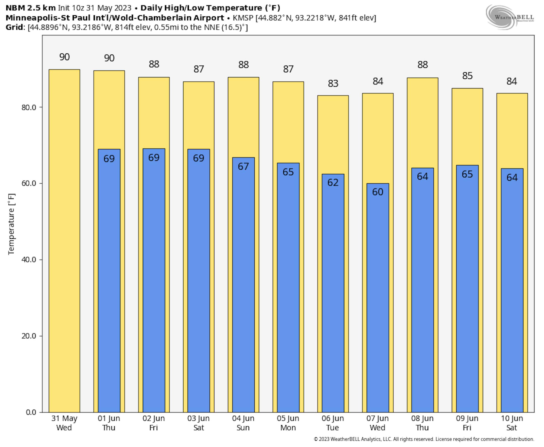 MSP finally hit 90F for the first time this year on Tuesday, reaching the mark at 3:49 PM. Across the entire Twin Cities record (back to 1873), the average first 90F has occurred on June 9th. Over the past 30 years (1993-2022), it has occurred on May 29th - so, our first was right around the recent average. In 2022, the first 90F occurred on May 12th.