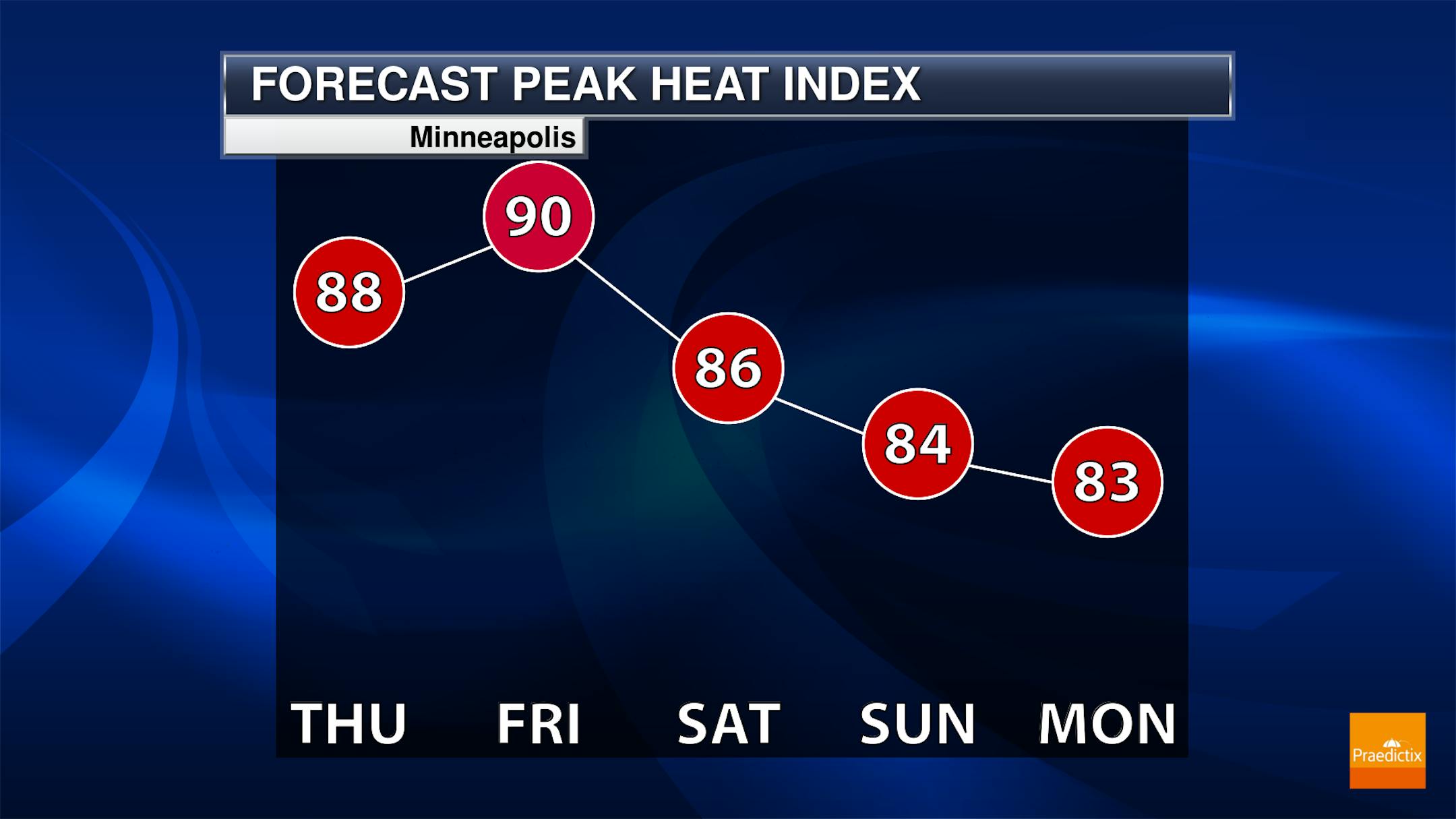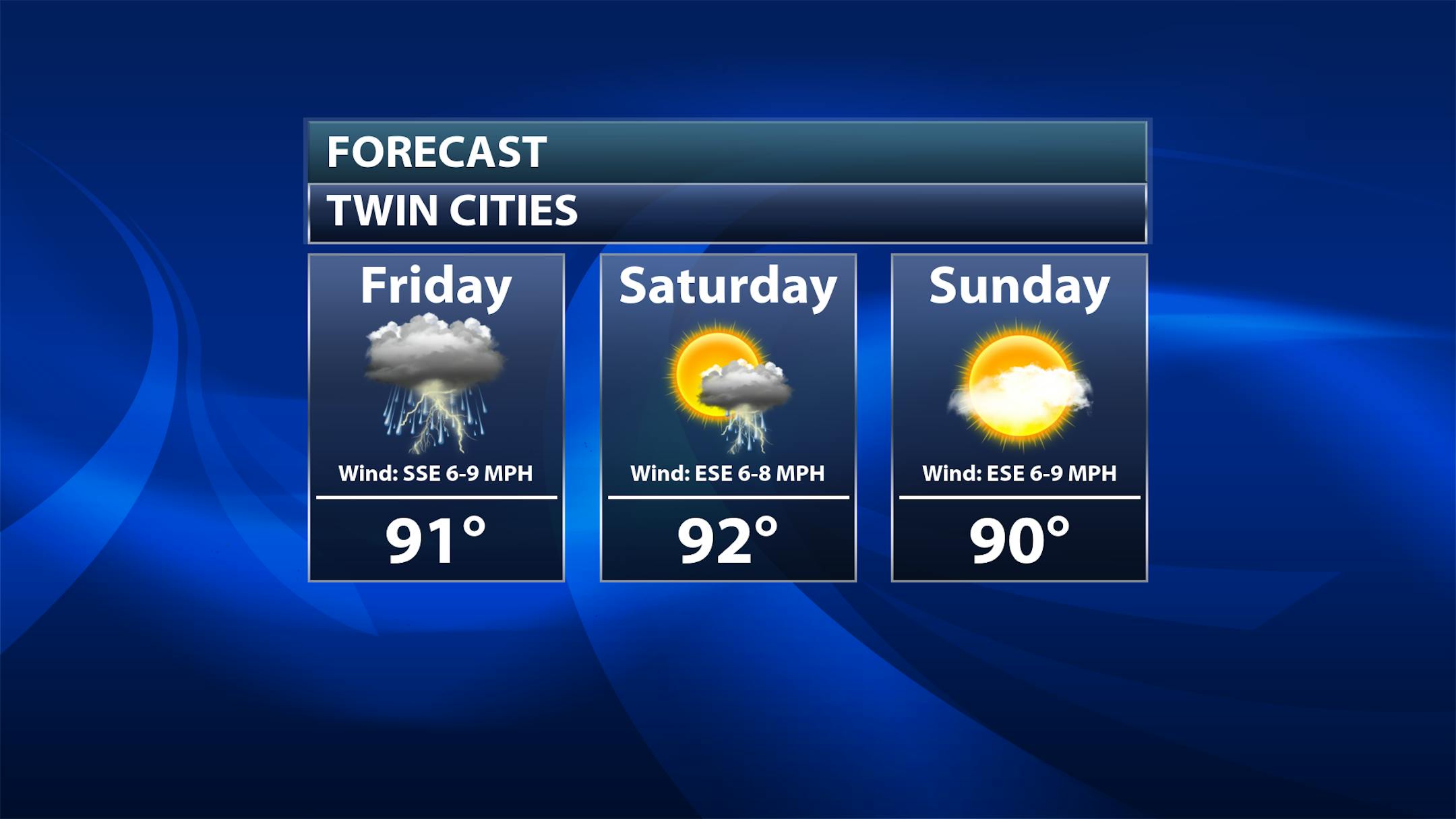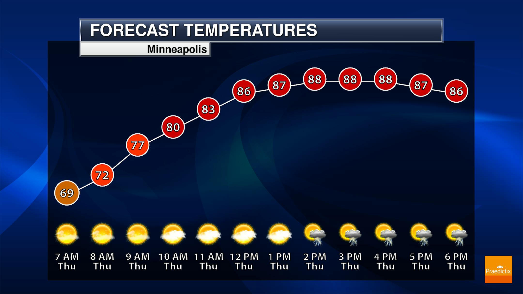 While we will start Thursday off sunny, we will (once again) watch the potential of pop-up storm activity as we head into the mid-afternoon through evening hours. Morning temperatures start off around 70F with highs around 90F. The record high in the Twin Cities Thursday is 92F, so we will be close to records - especially if we can see those storms wait until after the peak heating of the afternoon.