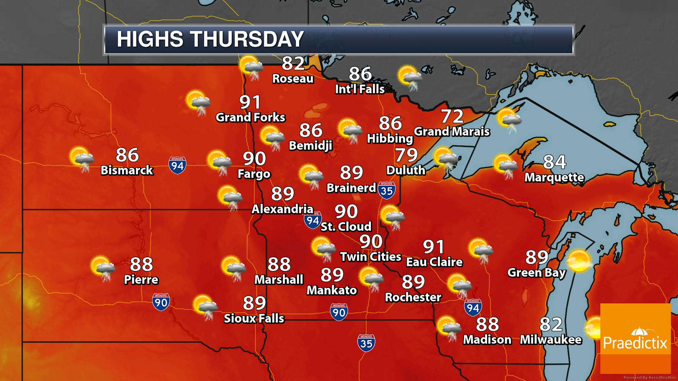 As we look statewide, we once again watch the potential of pop-up afternoon and evening storms just about anywhere - so make sure you stay alert of the weather if you have outdoor activities during the second half of Thursday. Highs will range from the 70s along the North Shore (thank you, lake influence!) to the low 90s across parts of western and southern Minnesota.