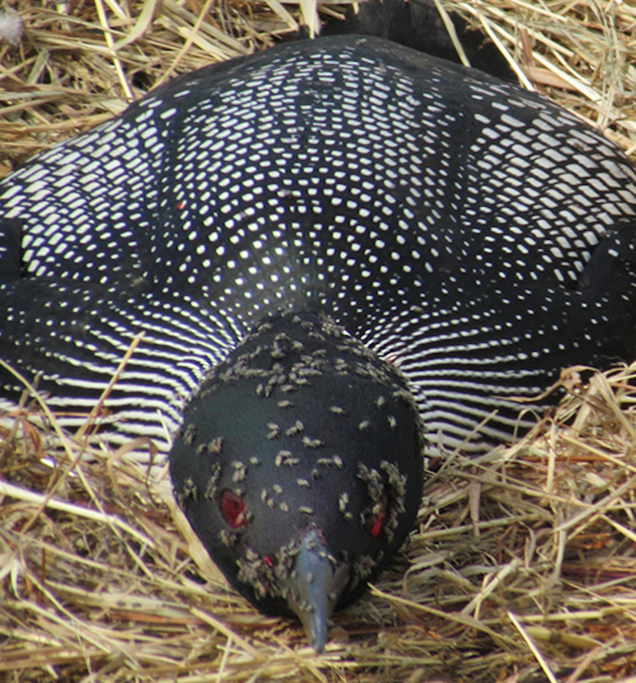 Reader Dan Laakso who owns a cabin on Lake Washburn near Outing, Minnesota, sent this photo of a Common Loon being attack by Black Flies. (See Wednesday birding column, Variety section, Home and Garden pages for story.) Dan says the loon was driven from its nest, presumably by the flies. The nest was abandoned on May 18. And this was last year, the problem even worse this year.