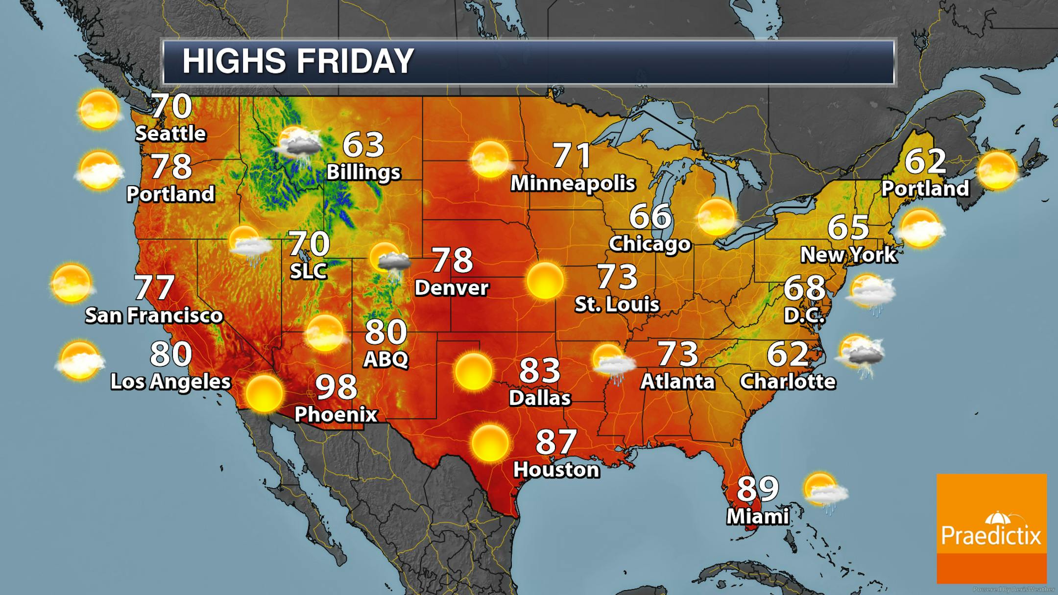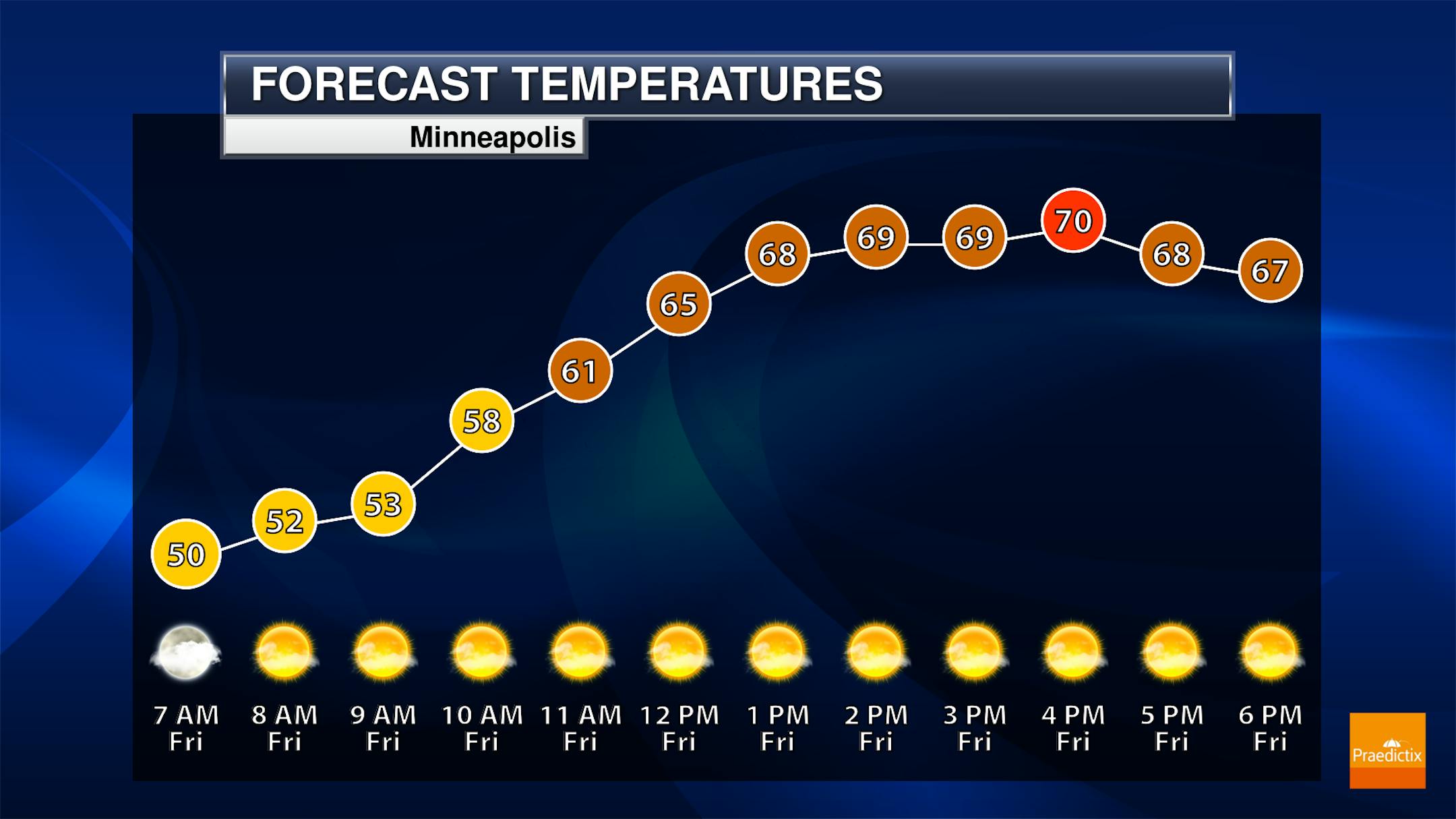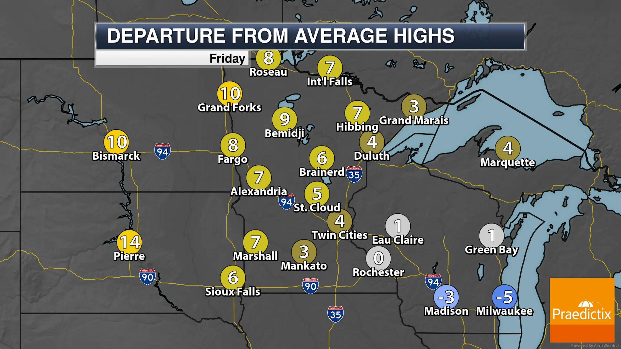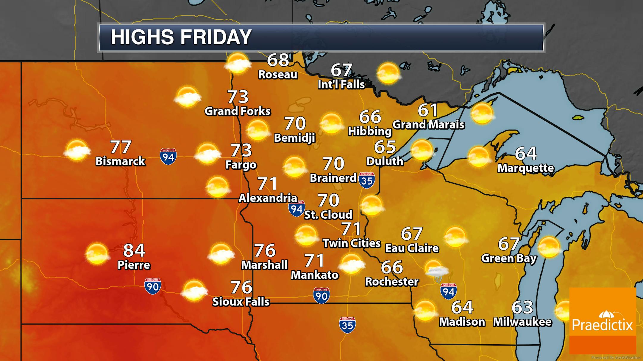 Another mainly sunny day is expected statewide on Friday, with highs from around average in southeastern Minnesota to 10F degrees above average out toward the border with the Dakotas. That means highs will be in the 60s and 70s across the state.