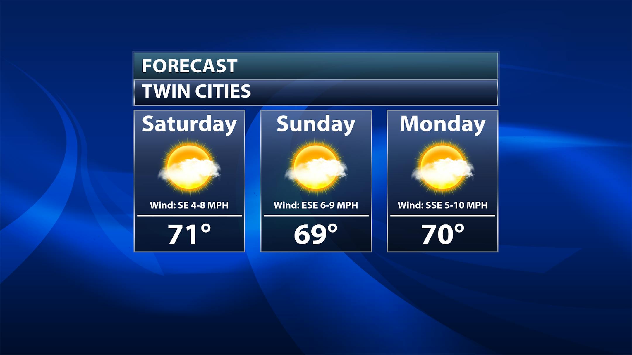 While it'll be a little breezy on Friday in the Twin Cities with southeast winds of 5-15 mph, it will otherwise be a nice end to the month of September. Mainly sunny skies are expected with highs climbing into the low 70s.