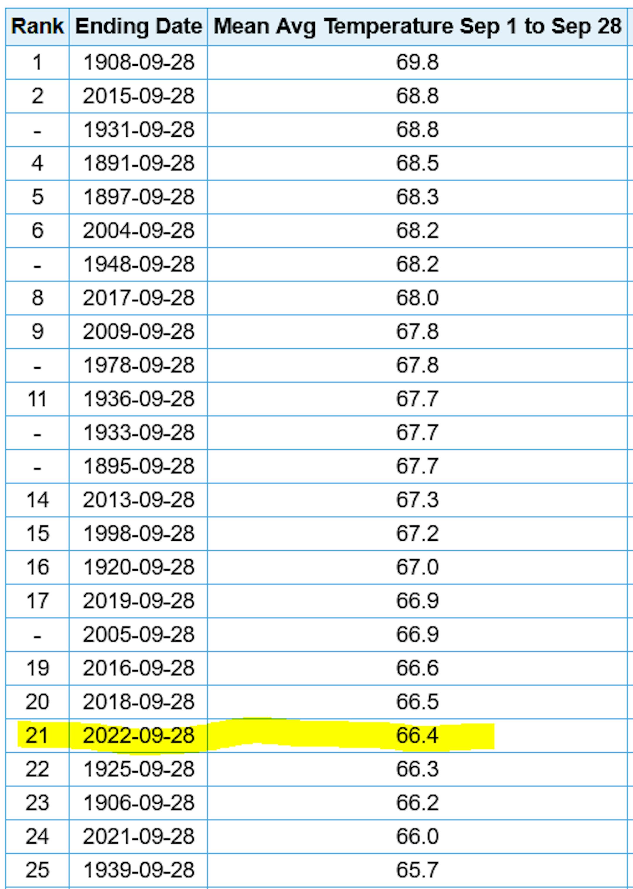 Meanwhile, it's been a warm September here in the Twin Cities, with an average temperature through the 28th of 66.4F. That makes it the 21st warmest September to date on record. We have observed one day with a high of 90F or greater (92F on the 20th), and ten days with a high of at least 80F.