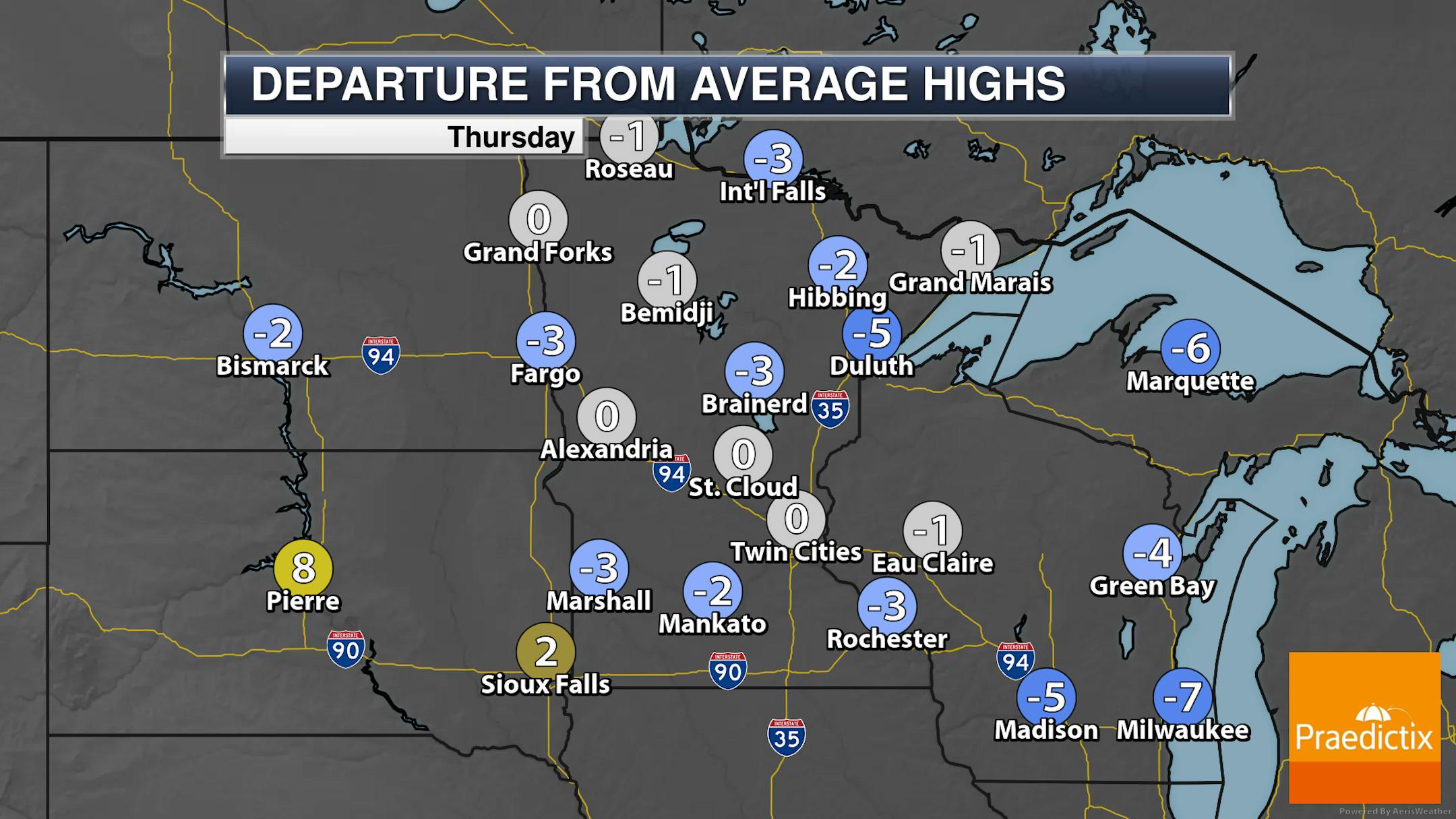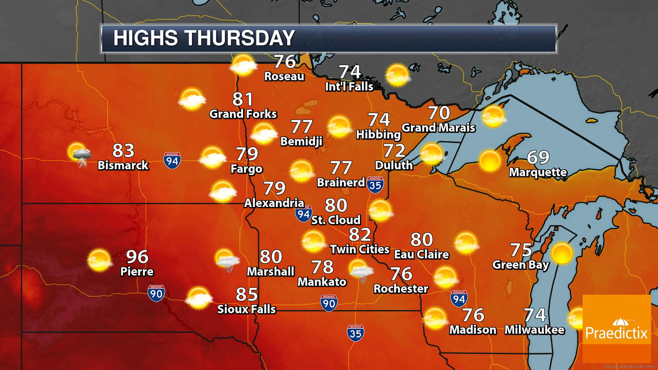 Highs will be around to slightly below average across the state on Thursday behind that cold front that moved through on Wednesday with highs in the 70s and 80s expected. Thursday will be another day with plenty of sunshine, though morning clouds will be possible in southern Minnesota. Meanwhile, clouds will start to thicken in northern Minnesota during the afternoon and evening hours.