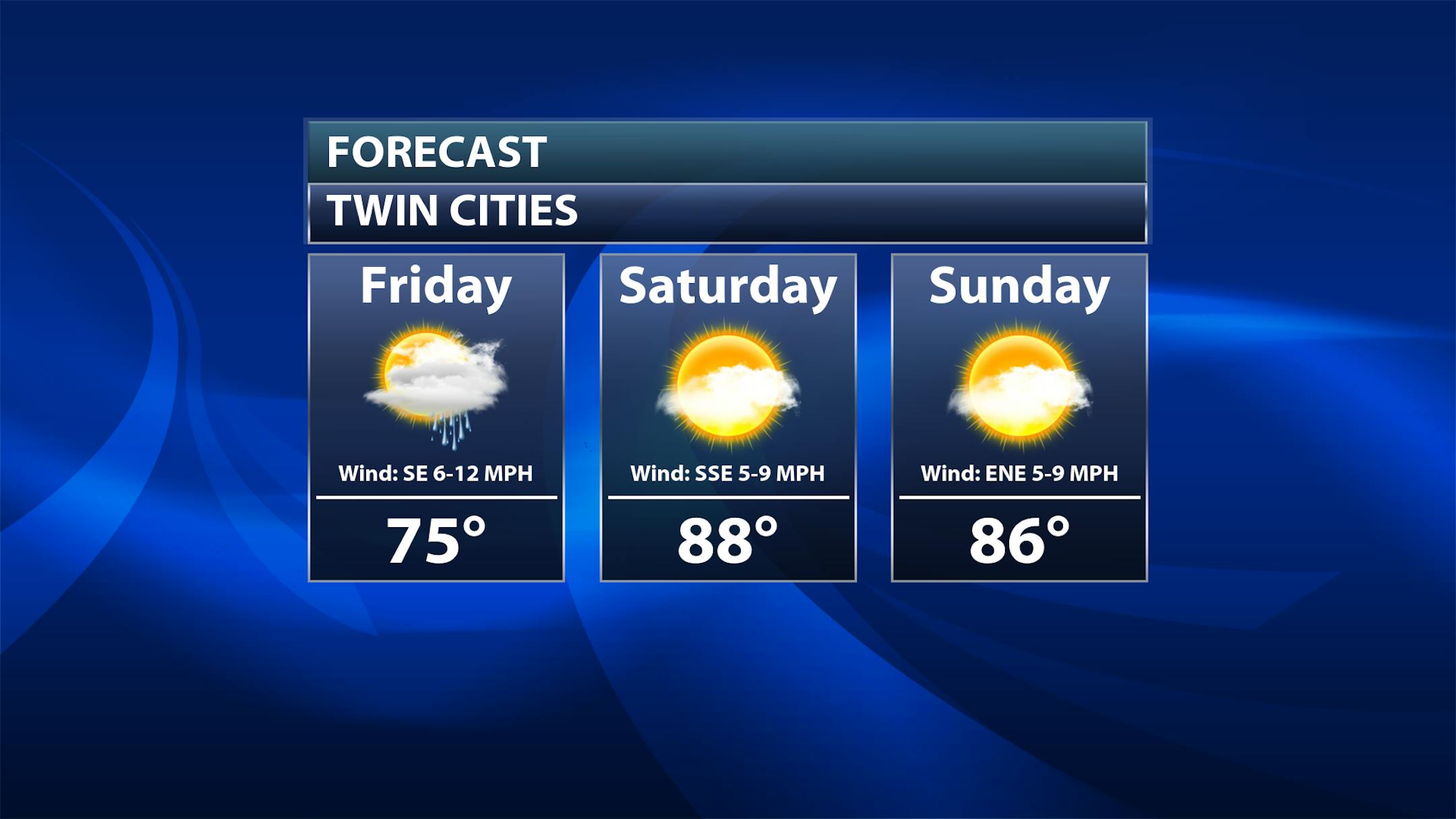 Along with the rain chances on Friday, temperatures will only reach the mid-70s. Highs will rebound up to near 90F on Saturday as an area of low pressure moves across southern Minnesota, helping to usher that warmer (and more humid) air in. Temperatures will be slightly cooler on Sunday, only reaching the mid-80s. Both days should feature plenty of sunshine.