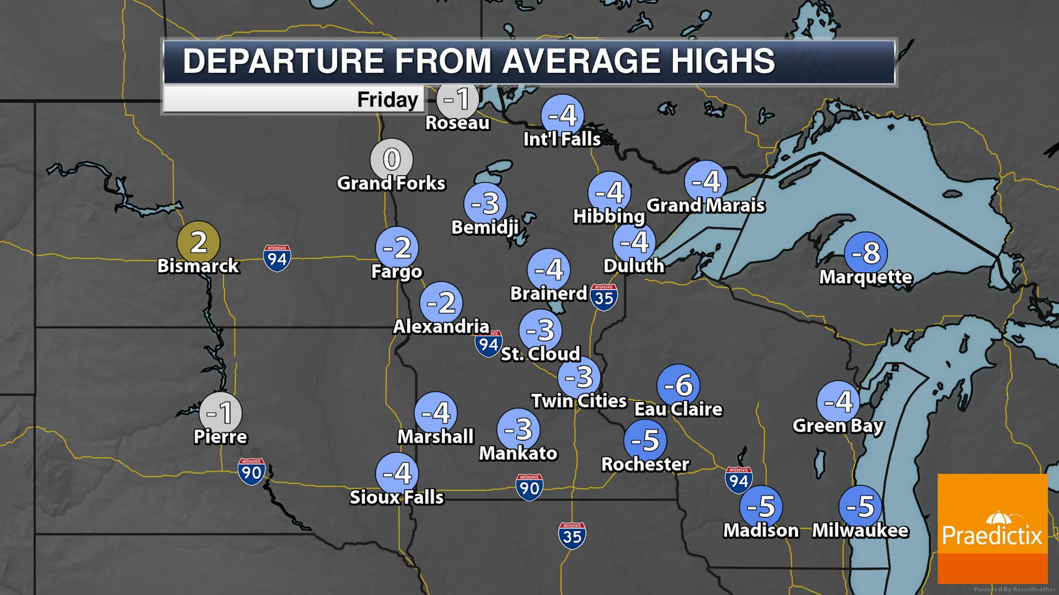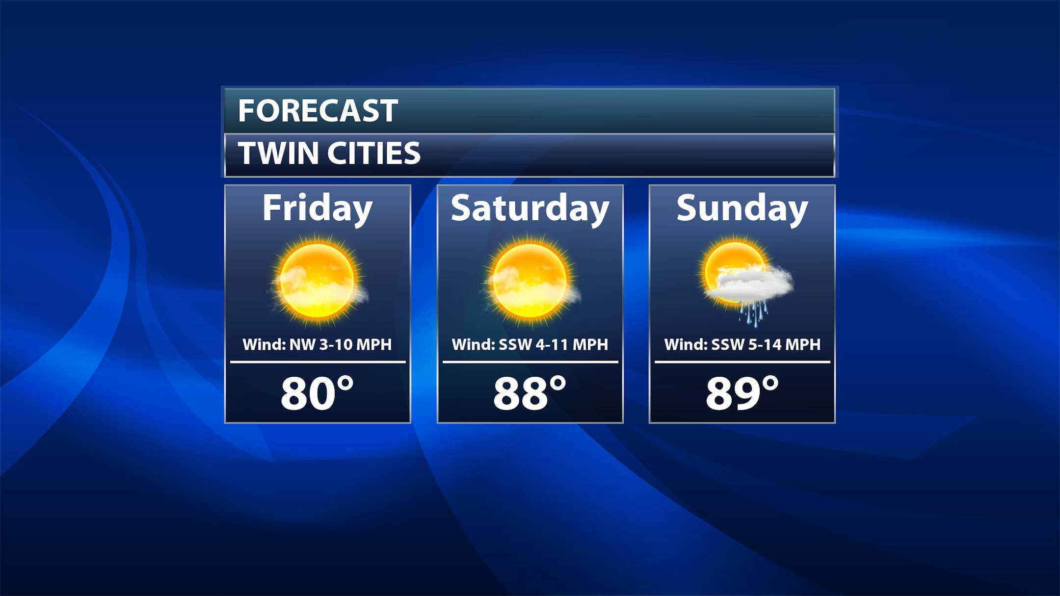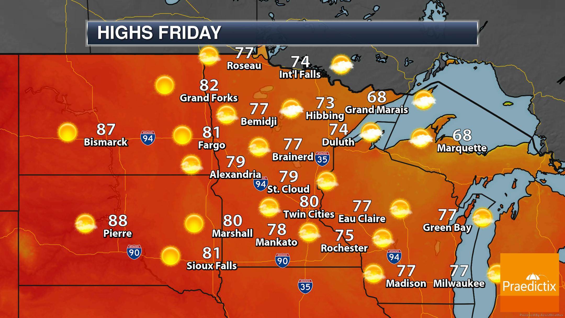 Make sure you have your windows open Thursday Night, as we'll wake up Friday in the upper 50s here in the Twin Cities with highs climbing to around 80F during the afternoon hours. Mainly sunny skies are expected, with the potential of a few more clouds creeping in during the afternoon.