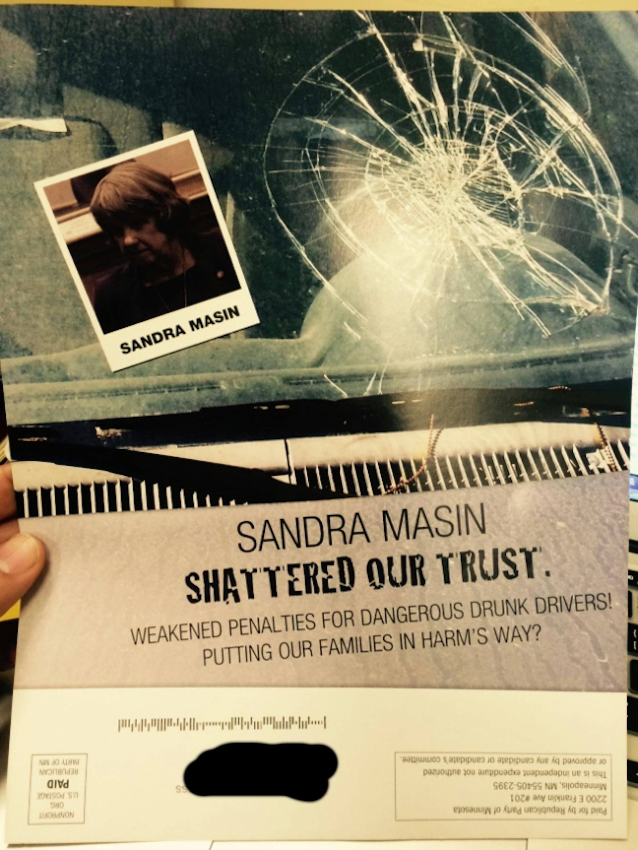 The mailers, which again target at least half-dozen DFL House members, give various accusations that they voted to make it easier for convicted drunken drivers to get back behind the wheel. One calls St. Cloud Rep. Zach Dorholt a "bar owner" who "weakened penalties for horrific drunk driving crashes," while another says Eagan Rep. Sandra Masin "Weakened penalties for dangerous drunk drivers. Putting our families in harm's way?" imposed over a background of a shattered windshield. The mailers are each marked as paid for by the Republican Party of Minnesota.
