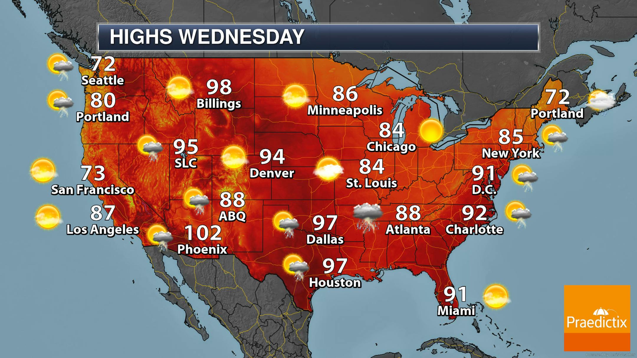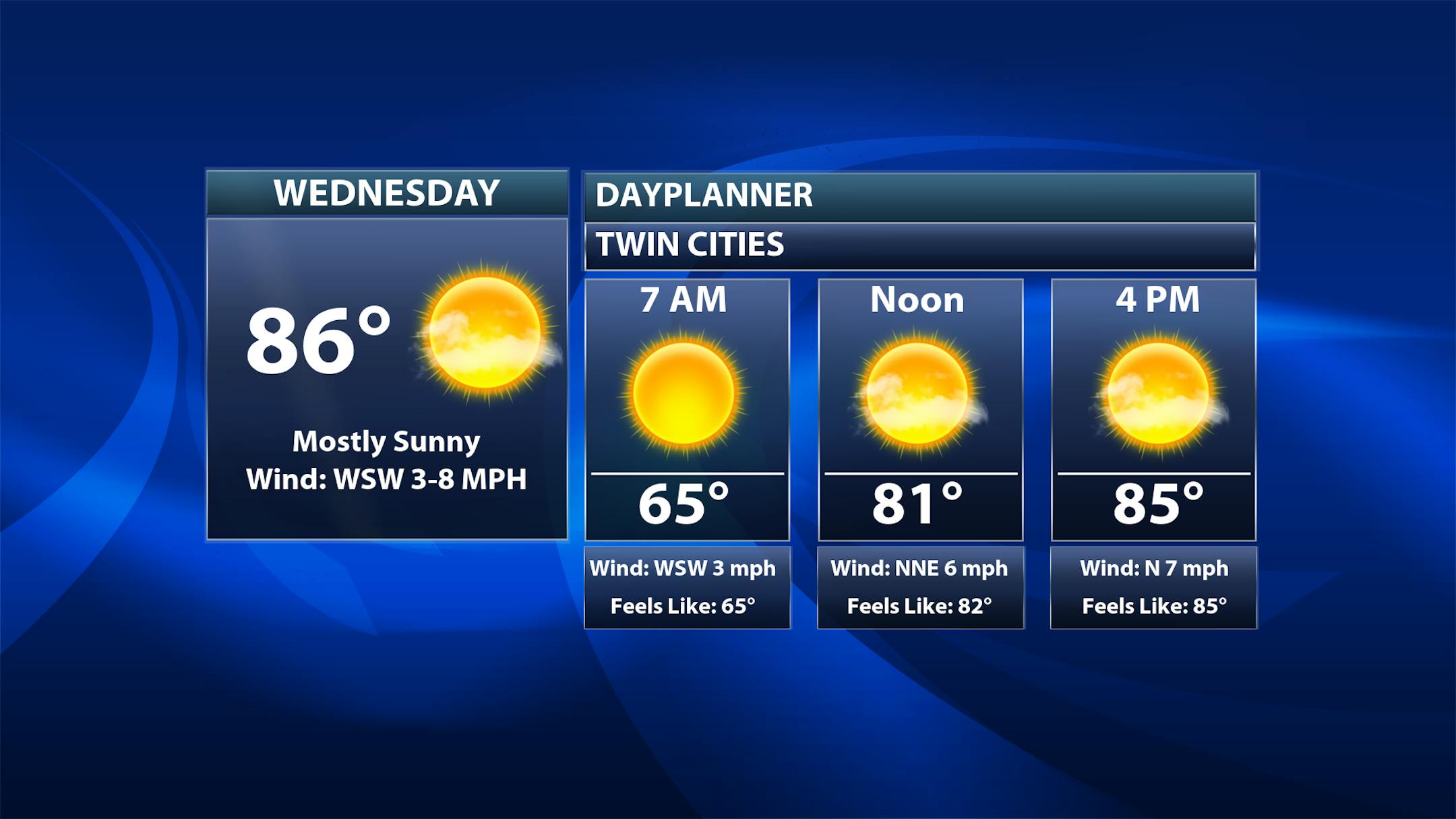 While a cold front will be pushing across the state on Wednesday, it'll be a dry frontal passage with plenty of sunshine in store. Morning temperatures will start off in the mid-60s with highs climbing to the mid-80s. Winds will start the day out of the west-southwest before becoming northerly after the front passes through. That front will also lead to slowly falling dewpoints during the day - starting off in the low 60s but falling to the mid-50s by the evening.