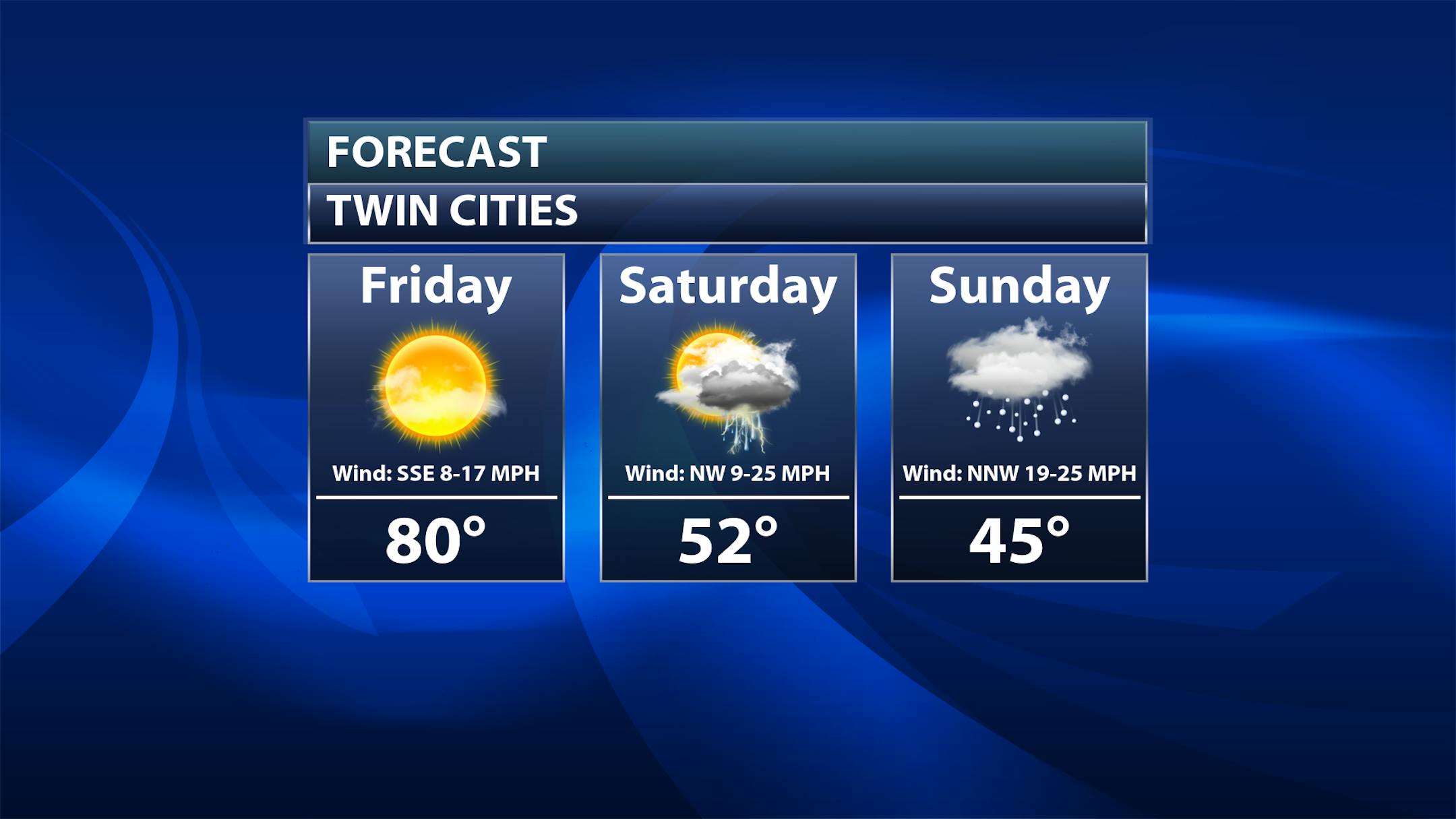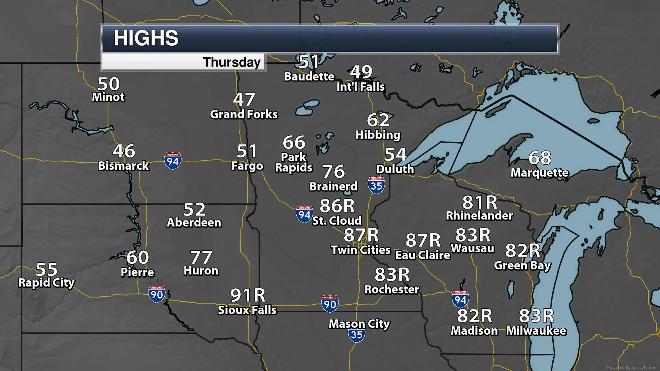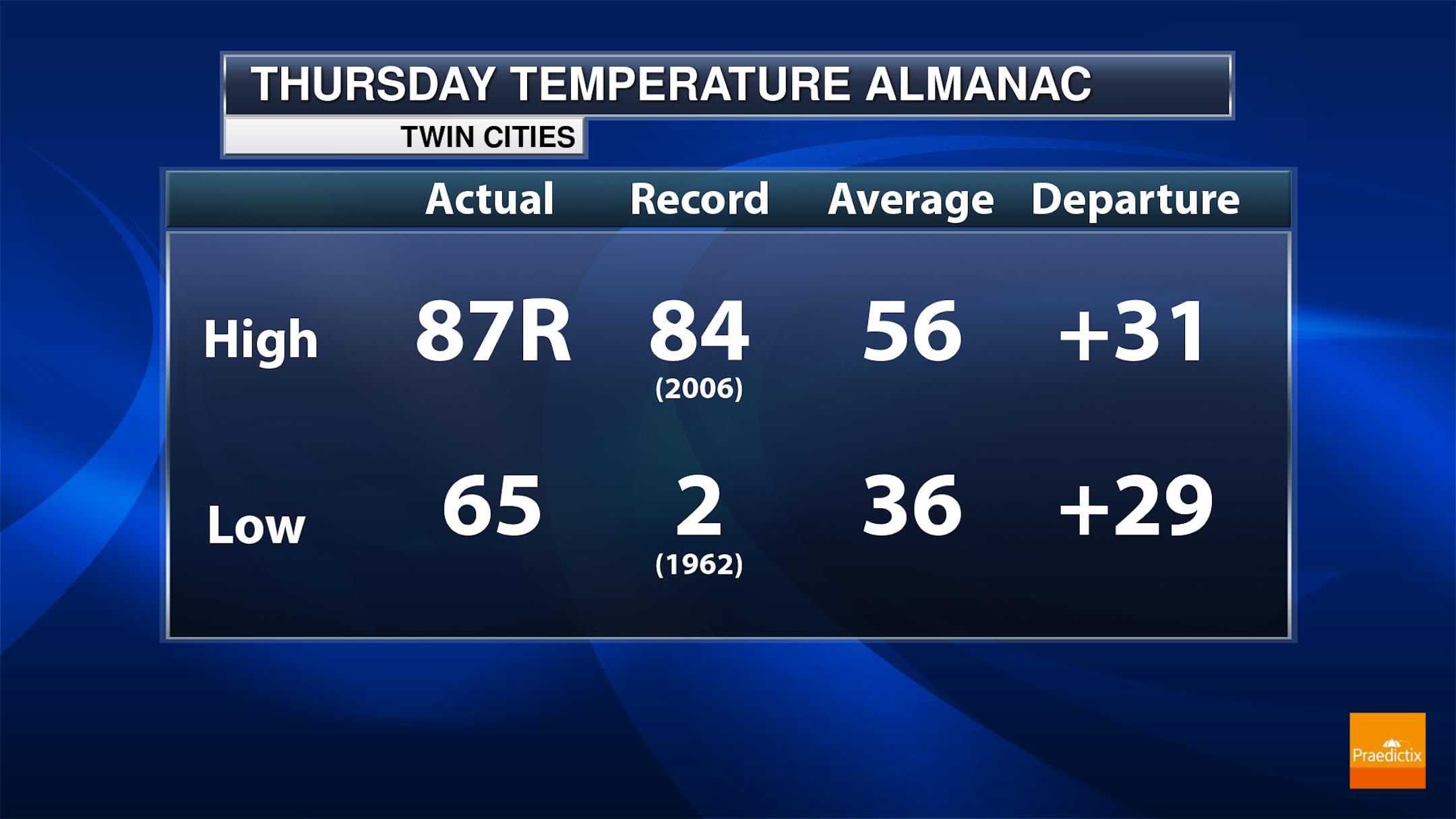 Thursday set more record highs across the region. The Twin Cities saw a high of 87F, beating the previous record of 84F in 2006. Other locations across the region that saw record highs included St. Cloud, Rochester, Eau Claire, and Sioux Falls.