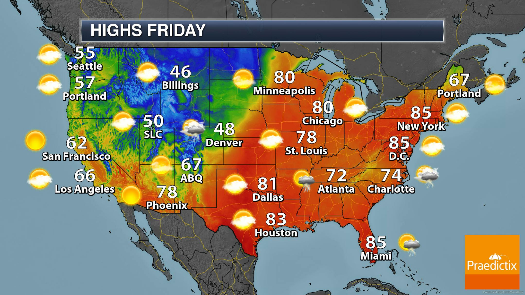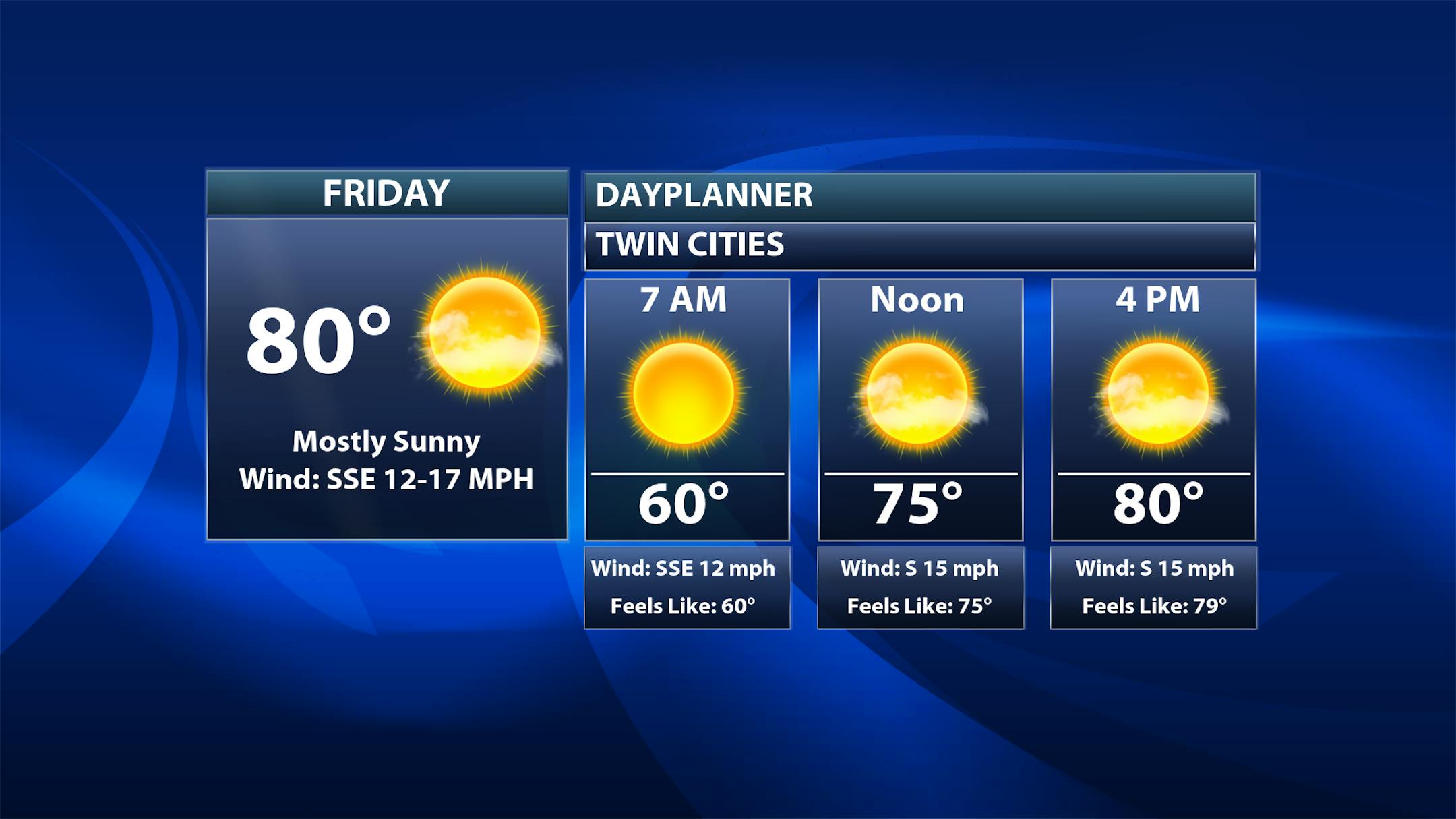 Friday will be another warm day here in the metro - though it won't be as warm (nor record-breaking). Morning temperatures start off around 60F with highs climbing up to around 80F under mainly sunny skies. Clouds will start to increase late in the day ahead of showers and potential thunderstorms that'll move in mainly overnight.