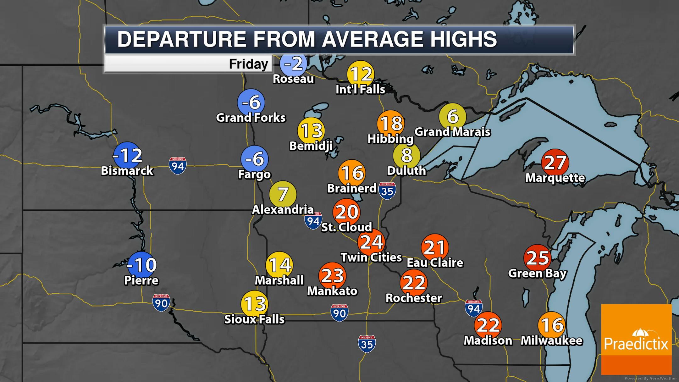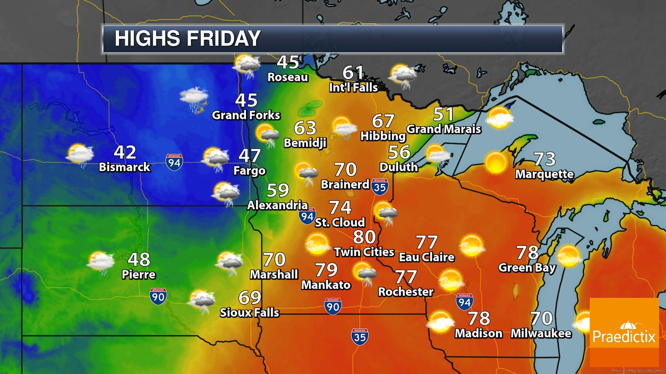 As a system and cold front slowly move east on Friday, we'll watch shower and storm chances mainly in the western half of Minnesota during the day. Those rain chances move east into the evening (and I'll have more on those rain chances below). Temperatures range from the 40s in the Red River Valley (a few degrees below average) to the low 80s across parts of southern Minnesota (up to 25F degrees above average).