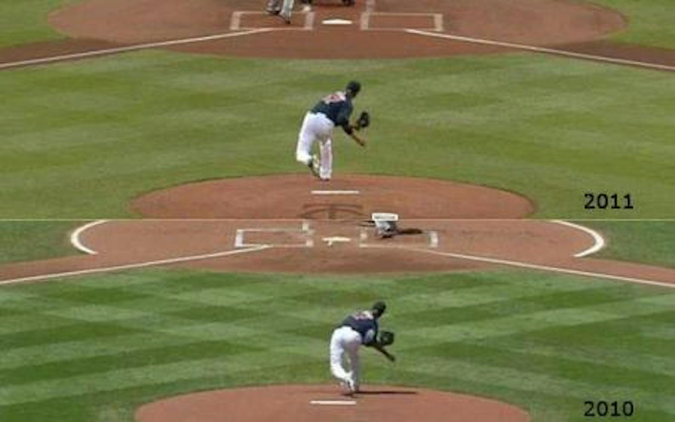 Unequivocally, Liriano's success starts with his fastball. When he is able to throw it over for a strike on a regular basis, it sets up his slider and change-up. So far this year, Liriano has struggled mightily to throw his fastball over the plate but moreover, when he does, it typically is his fastball that is hanging out there for opponents to slap around. While Liriano was never a zen-master of control over his heater last year, he still maintained a respectable ability to get it over for a strike. That likelihood has plummeted hard: Liriano's fastball command Strike% 2010 63% 2011 54% In addition to owning the league's lowest strike rate with his fastball, he also has the second-highest well-hit average (.385) on the pitch as well. Scouring the video archives, there seems to be a small yet critical difference in his delivery that could possibly be the source of his inability to get the ball down. In the first video from 2010, Liriano dials up a fastball to this particular right-handed hitting Ryan Spilborghs: