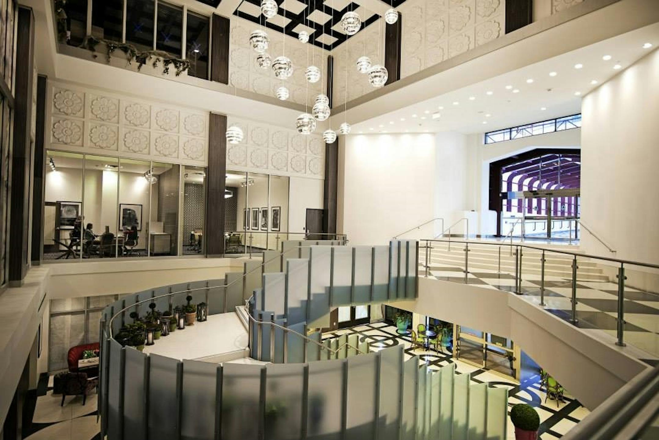 The building has a three-story boutique hotel-style lobby, with a floating glass staircase and terrazzo flooring, a private resident lobby and 24/7 concierge service. Other amenities include an indoor/outdoor rooftop pool, a "Sky Club" with a kitchen, fireplace and lounge seating, as well as an outdoor "Sky Park" with sun deck, yoga space, fire pit, bar and grilling stations. A fitness center, business center and conference facilities overlook the lobby.