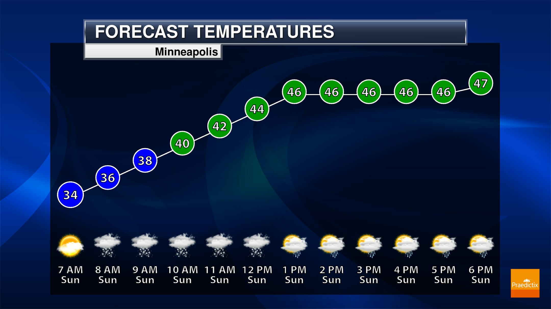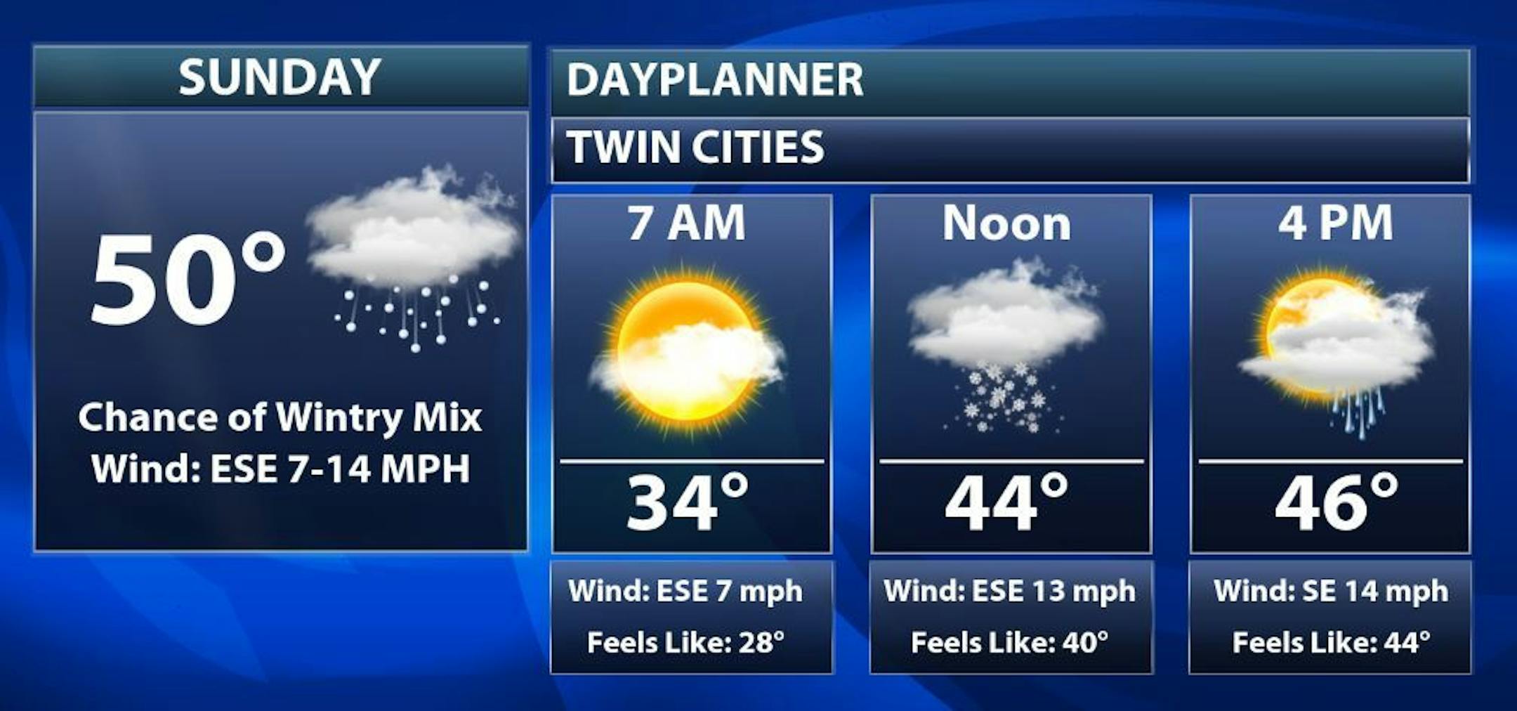 Here's a closer look at our weather conditions for Minneapolis on Sunday, which shows dry and somewhat chilly weather to start the day. Areas of rain and snow will be possible by midday as temps approach the mid/upper 40s.