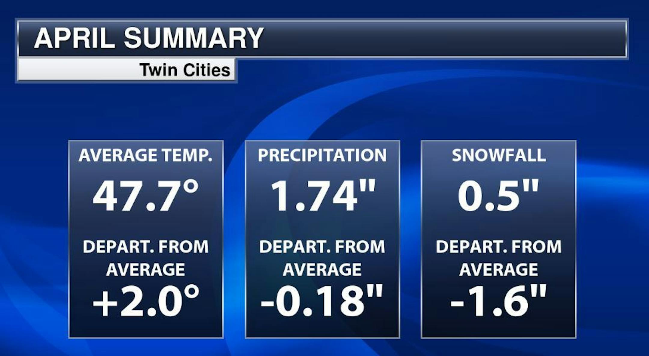 Here's the Twin Cities weather summary through April so far. Note that temps are still running nearly +2.0F above average even with several days of recent cool weather. We're also running -0.18" below average in the precipitation department and nearly -1.5" below average in the snowfall department.