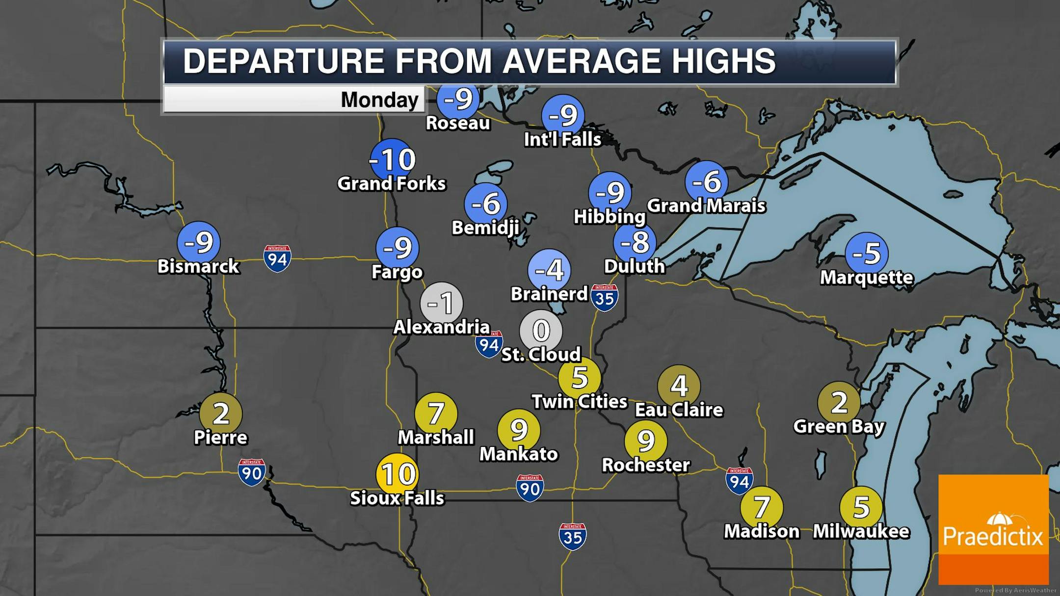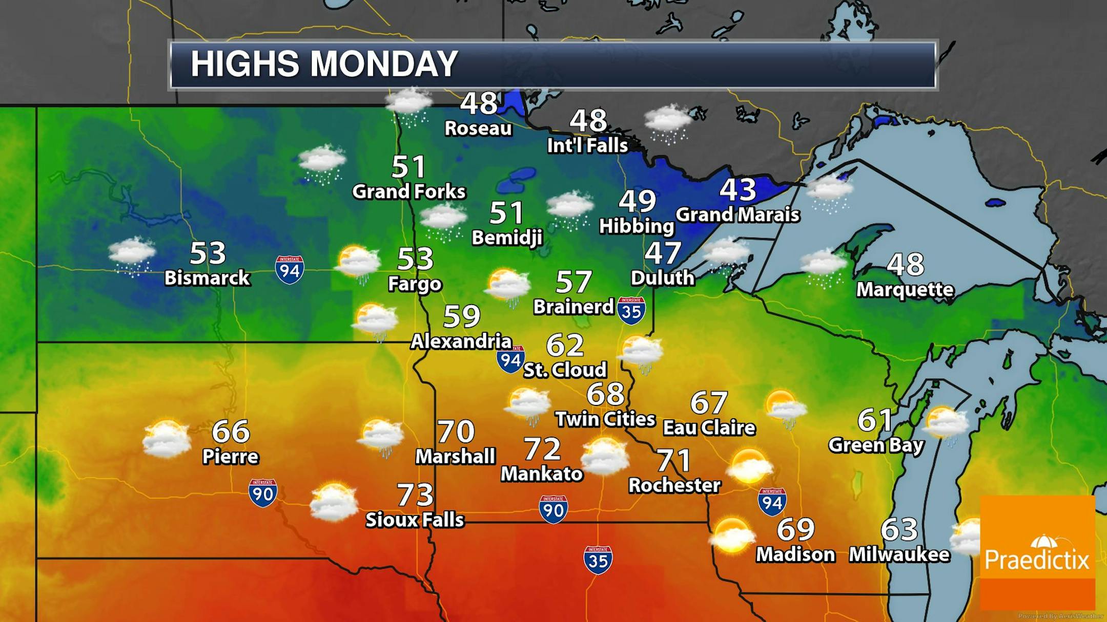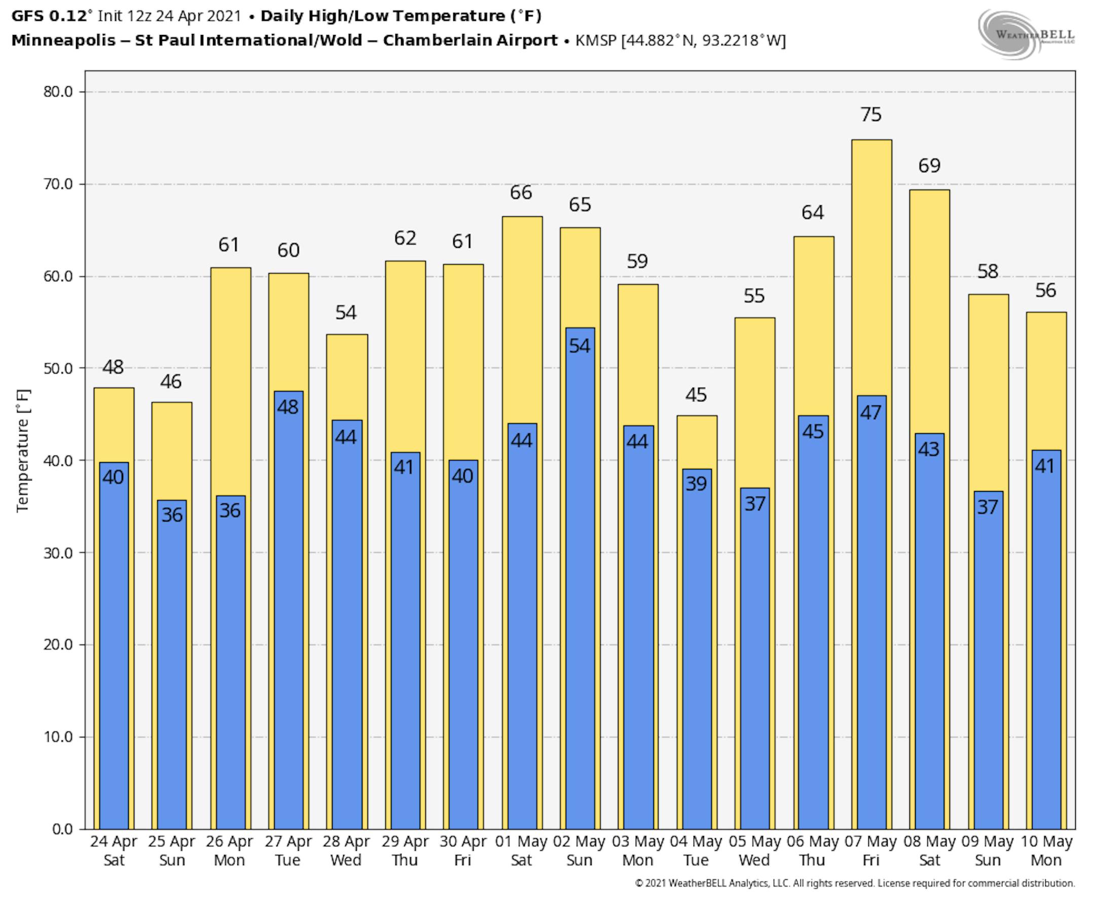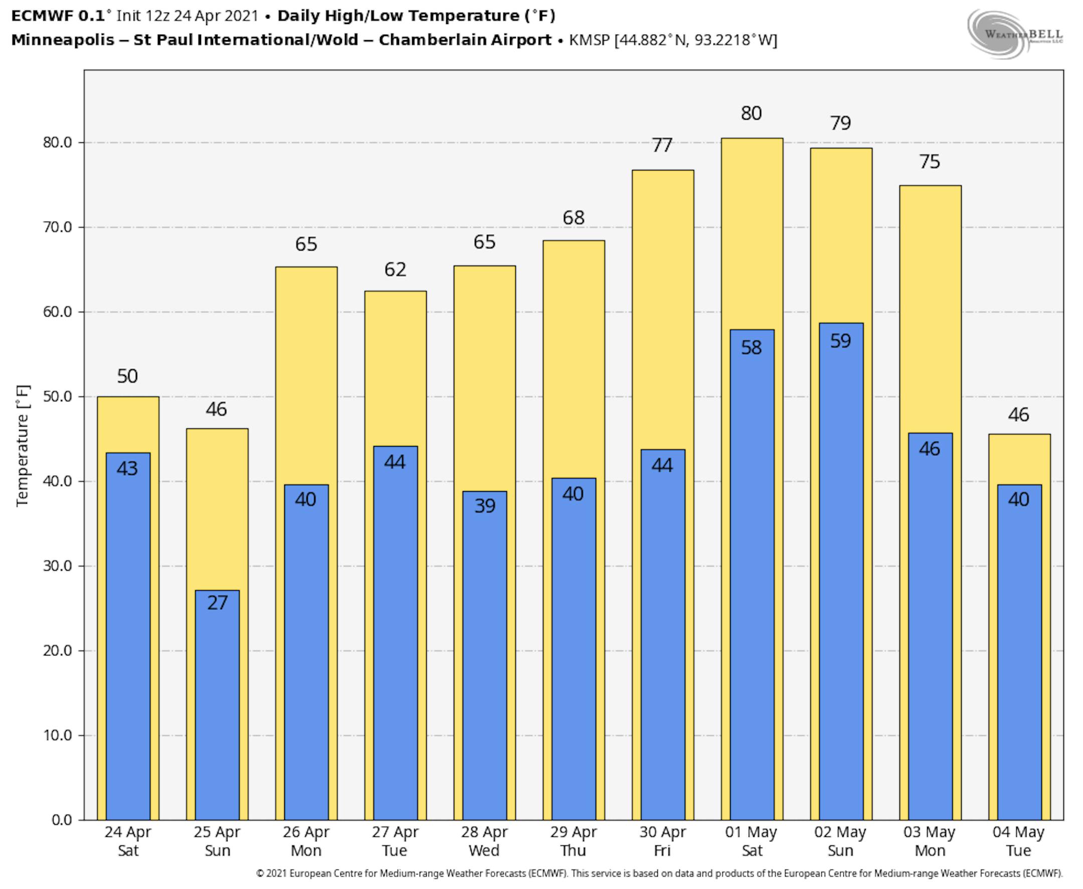 Temps on Monday will be quite a bit warmer across the southern half of the state with readings warming to near 70F, including the Twin Cities. The northern half of the state will still be running nearly -5F to -10F below average with areas of rain/snow still possible.