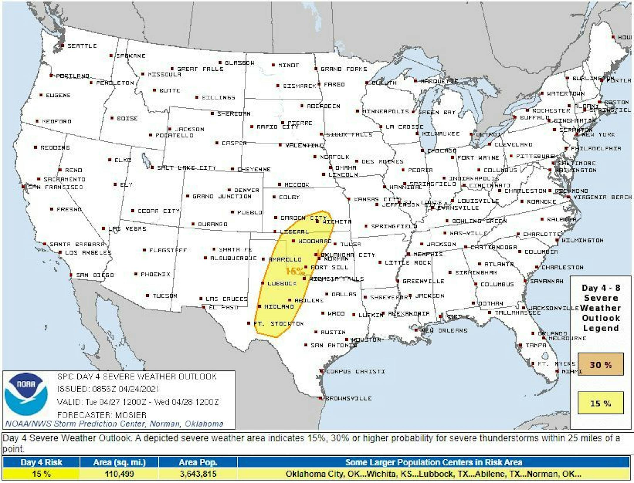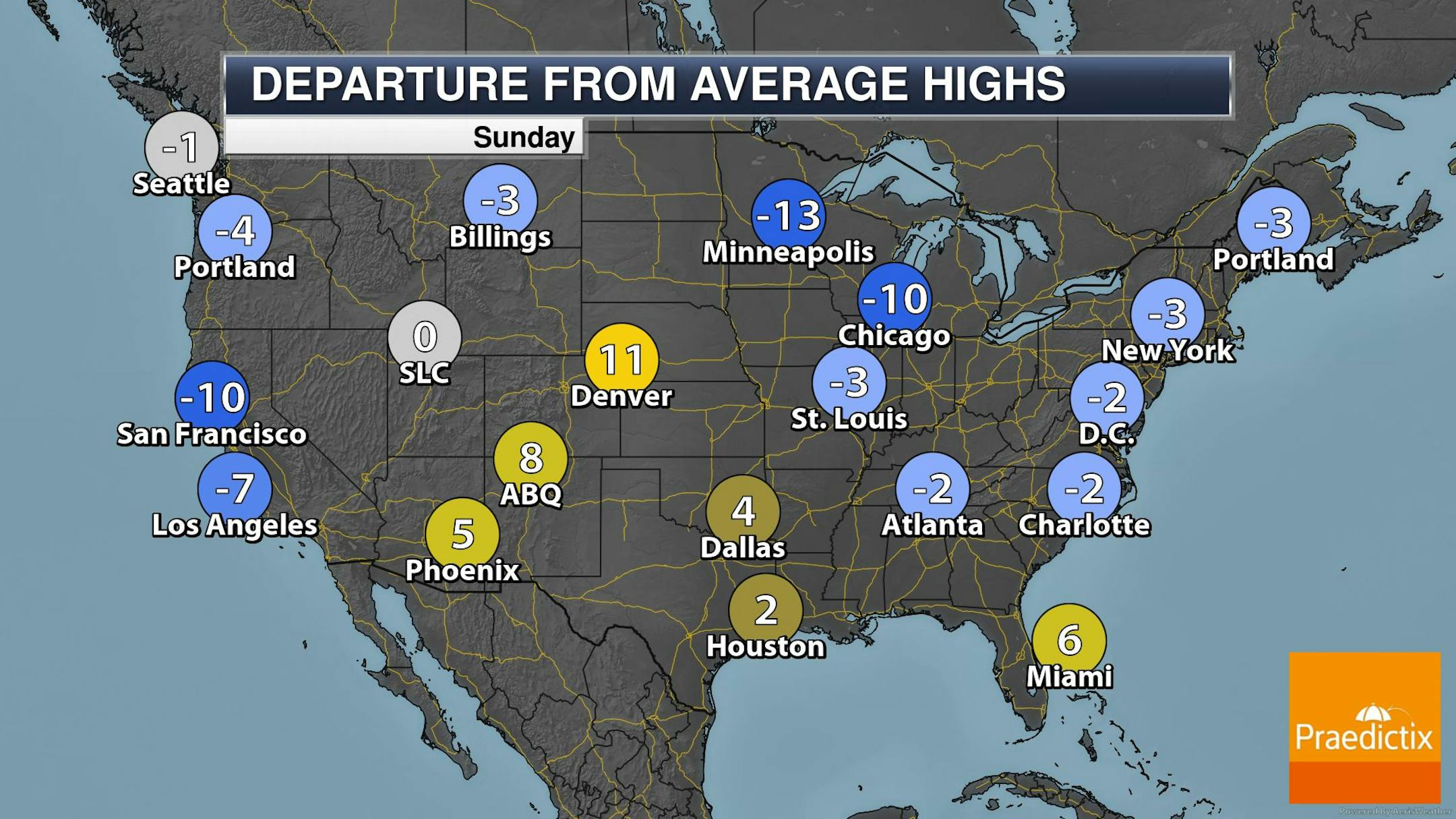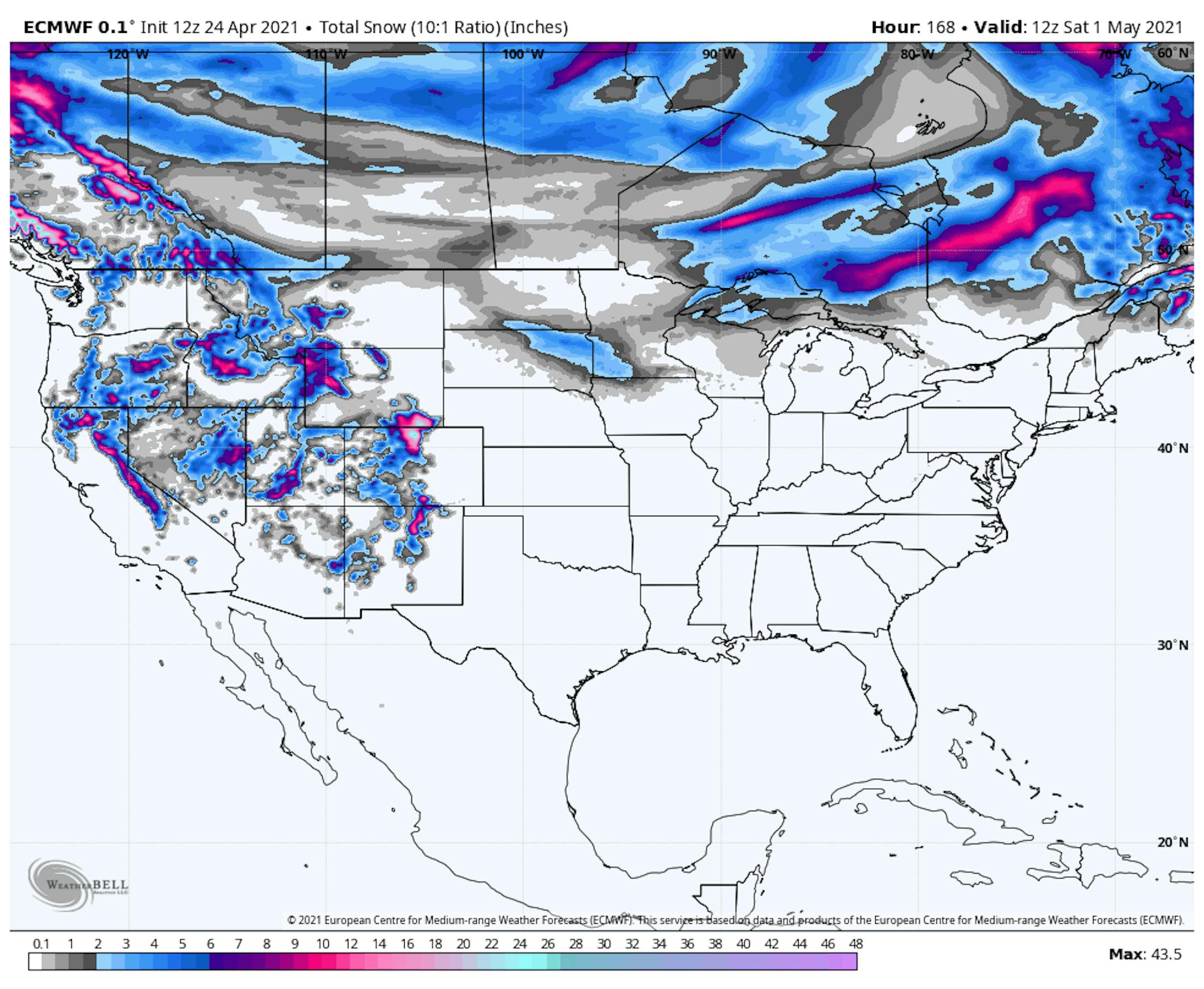 The weather outlook for Sunday shows somewhat unsettled weather moving through the region during the day with light rain/snow potential. Temps will be running below average by nearly -10F to -15F with readings only warming into the 40s and 50s.