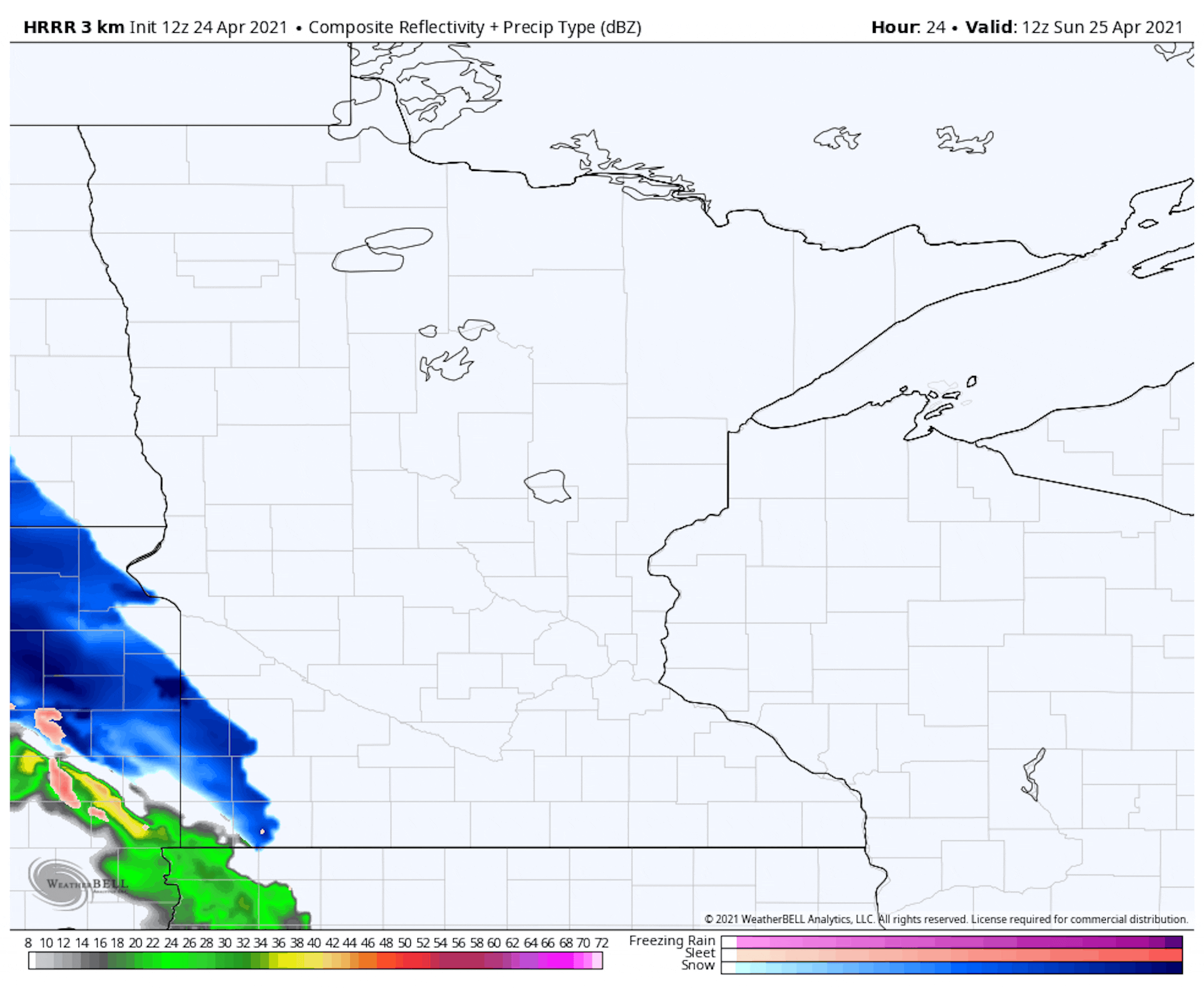 A warm front will lift through the region on Sunday with a narrow band of rain and snow showers sliding northeast through the day. Total precipitation amounts could approach 0.25" in spots with a better chance of minor snow accumulations south and west of the Twin Cities.