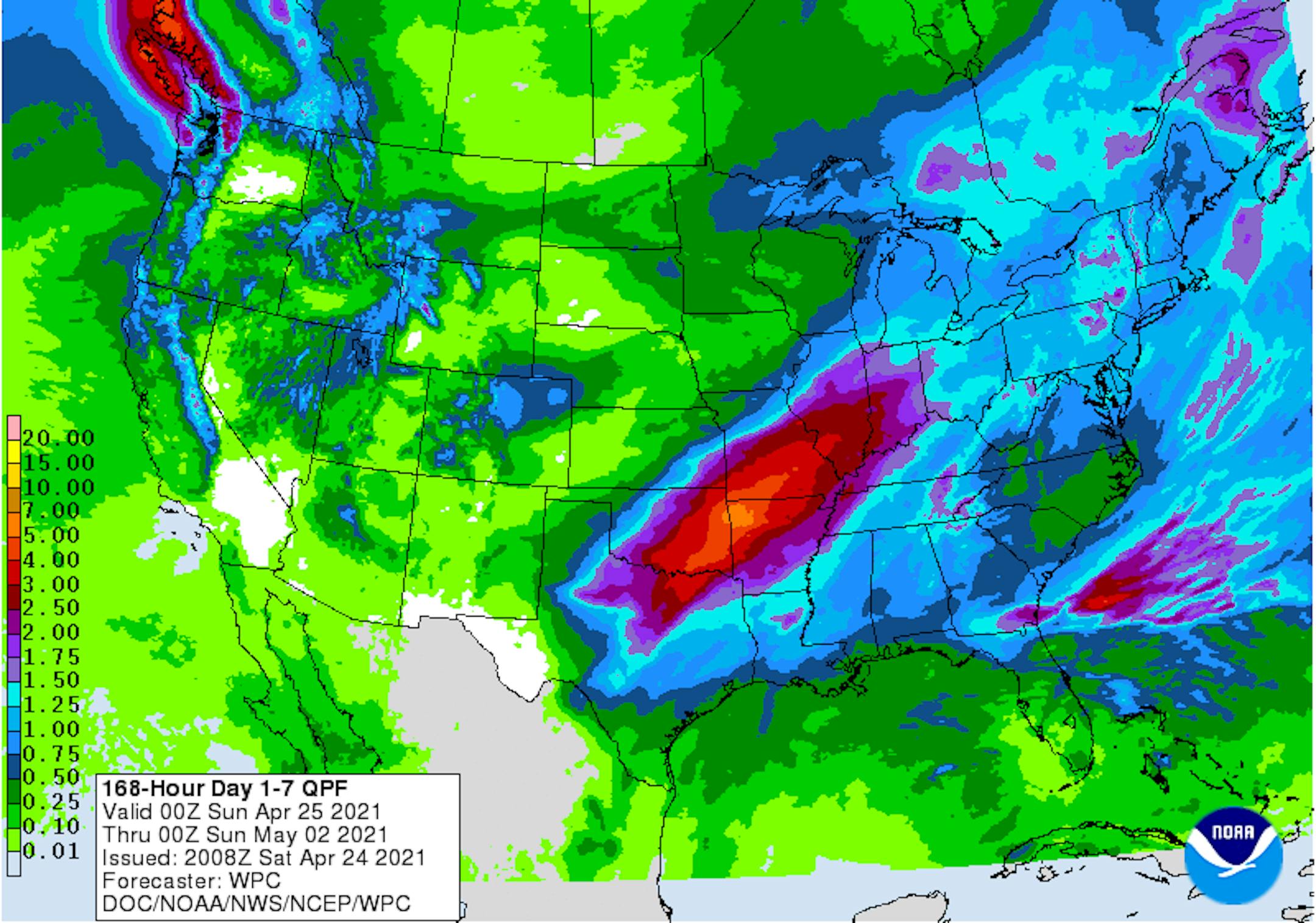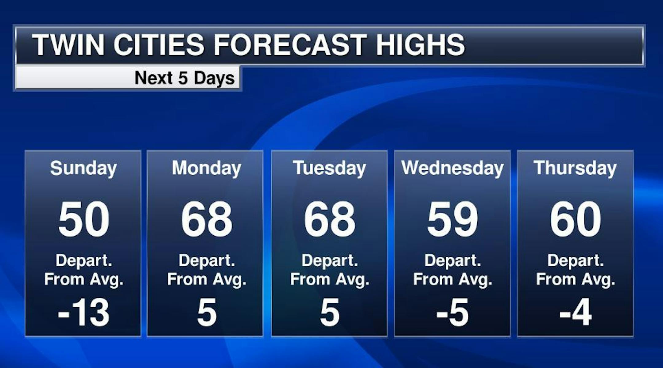 Here's the extended temperature and weather outlook over the next 5 to 7 days in the Twin Cities. Highs on Sunday will still be nearly -10F to -15F below average for mid/late April, but we could pop up close to 70F on Monday and Tuesday, which would be nearly +5F above average. Areas of rain and possibly thunder will linger through midweek.