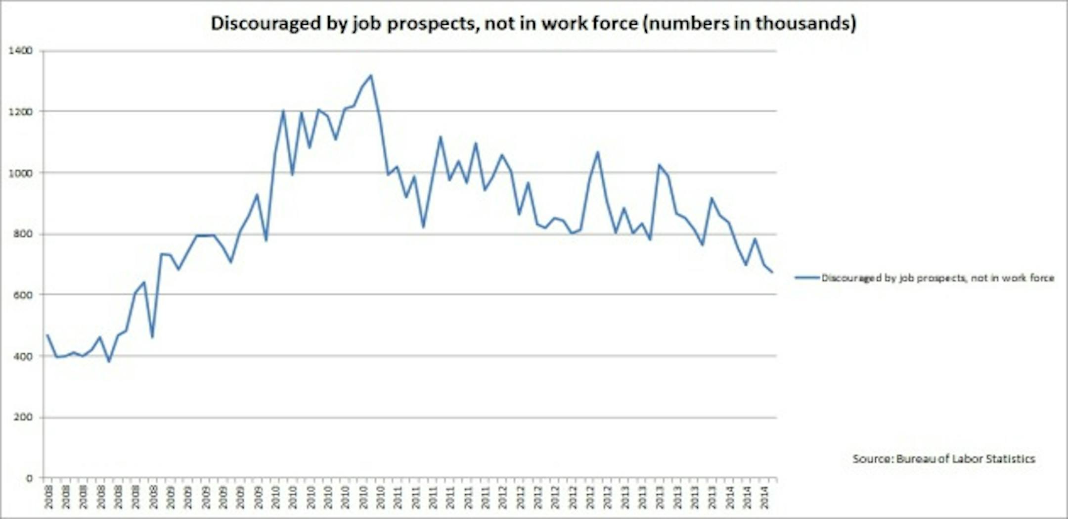 But the number of discouraged workers in America can no longer be used as an explanation for why unemployment is falling. In June, according to the latest numbers from the Department of Labor, the number of discouraged workers fell to 676,000, its lowest level since December 2008.