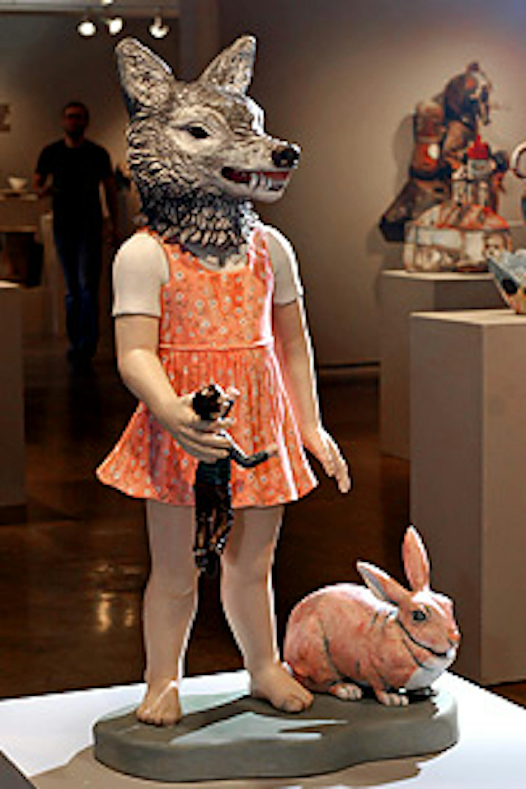 But lest anyone imagine that women are all victims here, Massachusetts artist Cynthia Consentino unleashed her antimale rage in the form of a 3-foot-tall "Wolf Girl" -- a wolf-headed child wearing a pretty pink frock and holding a tiny boy-toy by the neck, her finger pressed to his jugular. In smaller figurines, she screws a man's head to a dog's body and replaces a boy's left arm with a hammer. The mingling of innocence and latent violence amplifies the surreal undercurrents in her work.
