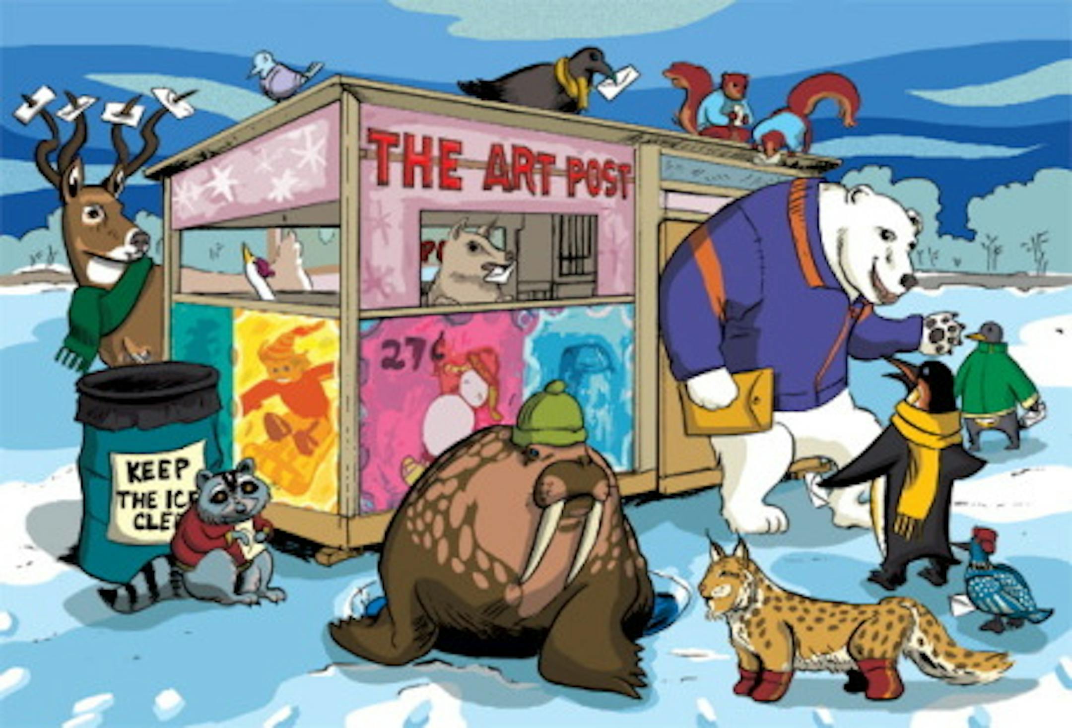 Artist Will Schar designed the postage stamp to accompany his official ArtPost Shanty card. Postmaster Cynthia M. Larson and postal public relations coordinator Michael LePree will unveil the new stamp and will hand-cancel postcards and letters at the ArtPost Shanty following the opening day ceremonies. Other ArtPost participants Janet Groenert, Jackie Lannin, Deb Miller, Tina Nemetz, Kathleen Reitan, Jamie Winter-Dawson and Jill Waterhouse will offer free postcard making sessions. The group is also hosting a Mail Art exhibition.