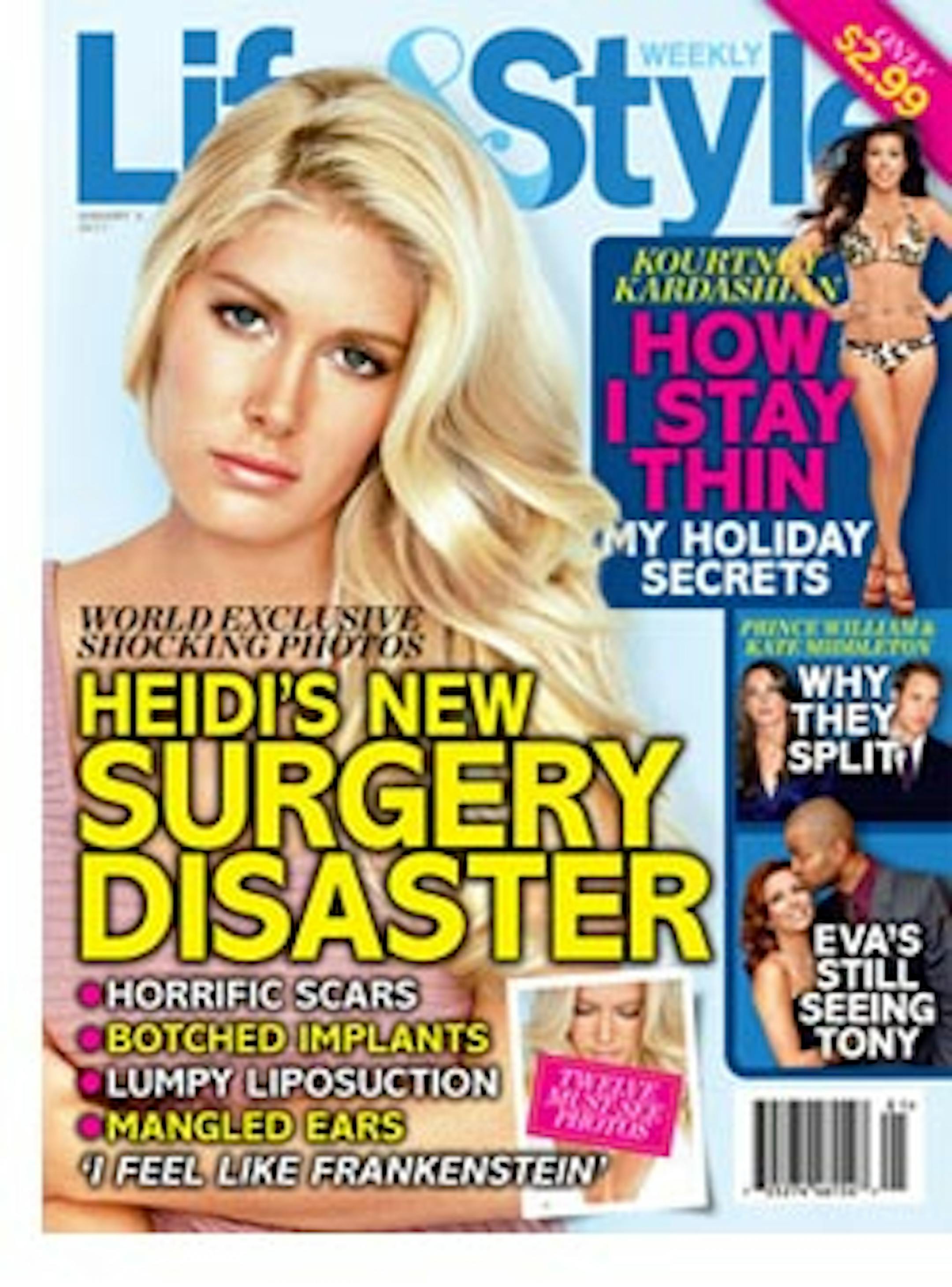 The inexplicably famous Heidi Montag has gone public with the results of her recent plastic surgery binge. Mangled ears, Edward-Scissorhands face, Dollar-Store-quality implants, and that unbeatable combination of exhibitionism and poor self-image: no wonder she's not single!