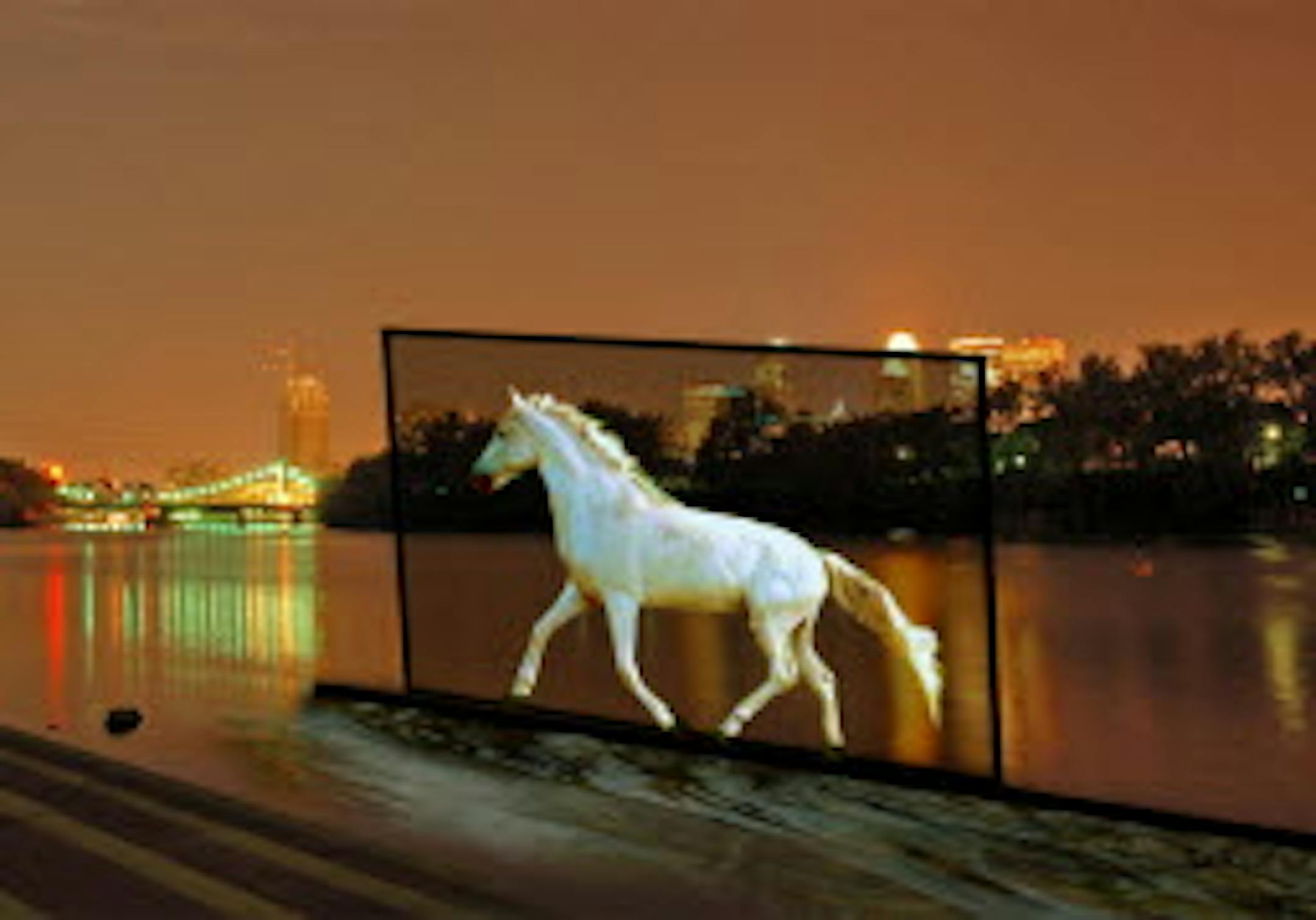 The illusory horse, moving in slow motion, will appear on a large video screen pulled by a barge. At first, going downriver, it will be visible only from the Harriet Island side of the river as it runs past the Wabasha Bridge toward Lowertown St. Paul. Then it will turn around and head up river toward the High Bridge and Minneapolis. At that point, it should be visible from downtown St. Paul.