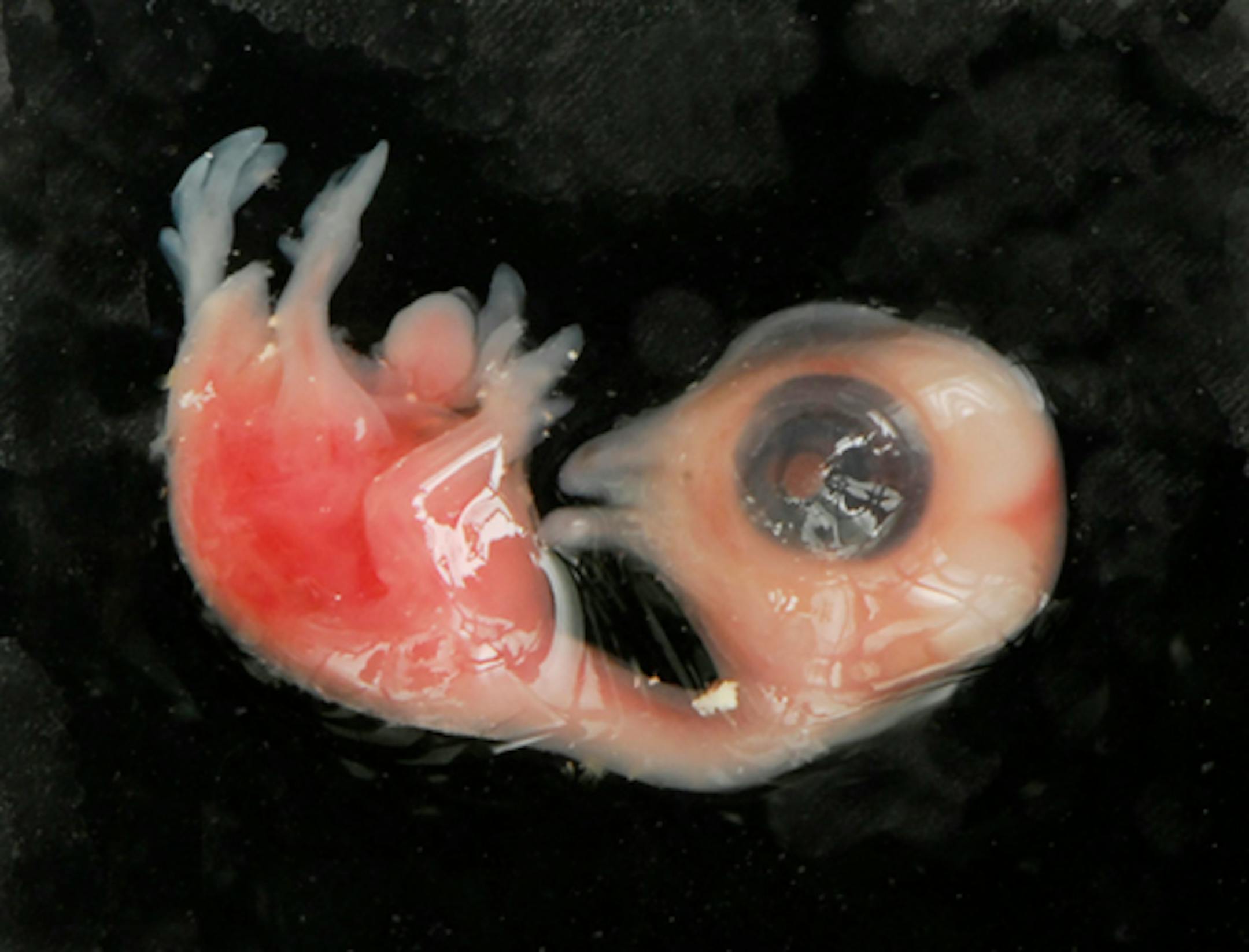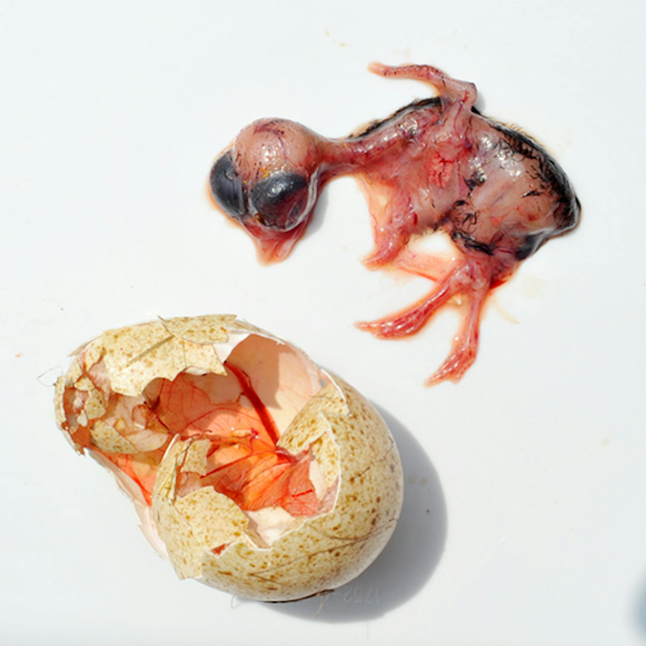 Here's a photo of the embryo of a Wild Turkey. It was removed from an egg I found on a gravel road at the golf course where I tend bird-nesting boxes. Two eggs were on the road, the second one empty and smashed flat. I assume this was the work of a predator. The egg from which I took the embryo had a hole about half the size of what you see here. I enlarged the hole to remove the embryo. Based on the development of an embryo I removed from a Canada Goose egg two years ago I estimate that the turkey egg had been in incubation for about 12 days (my guess). The dark splotches on the embryo are the first appearance of feathers. An enlargement of this photo clearly shows feathers along the bird's spine. The other feather indications are matted. The goose egg I examined was taken from an abandoned nest built on a platform in our pond. I timed incubation in that case. The female goose abandoned the nest after eight days of incubation. When the eggs had been untended for five days (with very cool nights) I removed them and opened one. That embryo is shown in the second photo. It was in better condition than that of the turkey, the latter having spent half a day in the sun.