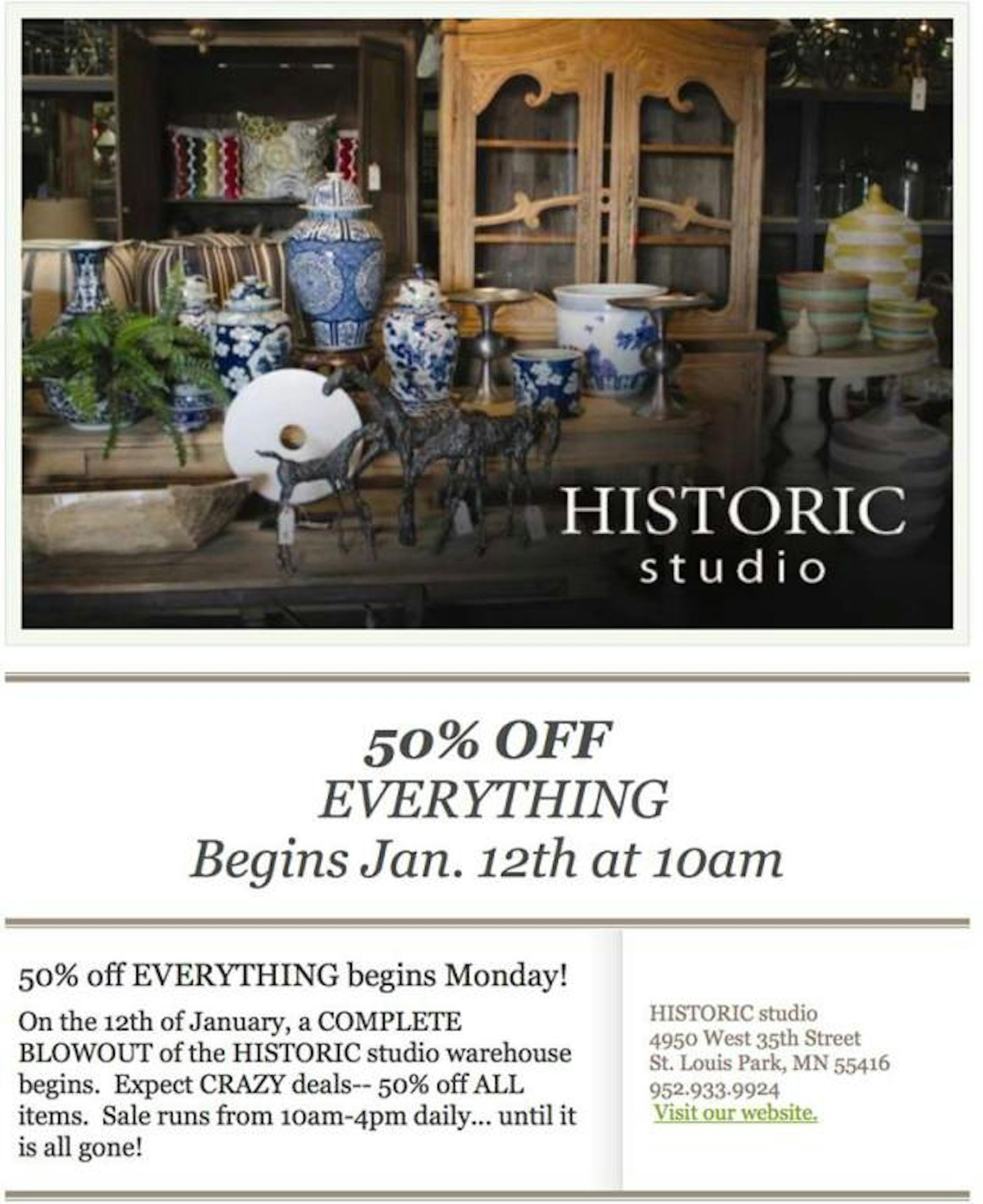 Historic Studio Interiors in St. Louis Park starts its 50% of everything sale Monday, Jan. 12. Many items were already marked down previously as Historic limits its warehouse space to add staff and office space. "We are expanding the interior design offerings to do both residential and commercial and also developing a product development arm to the business, which requires liquidating the warehouse space," said co-owner Robb Whittlef.