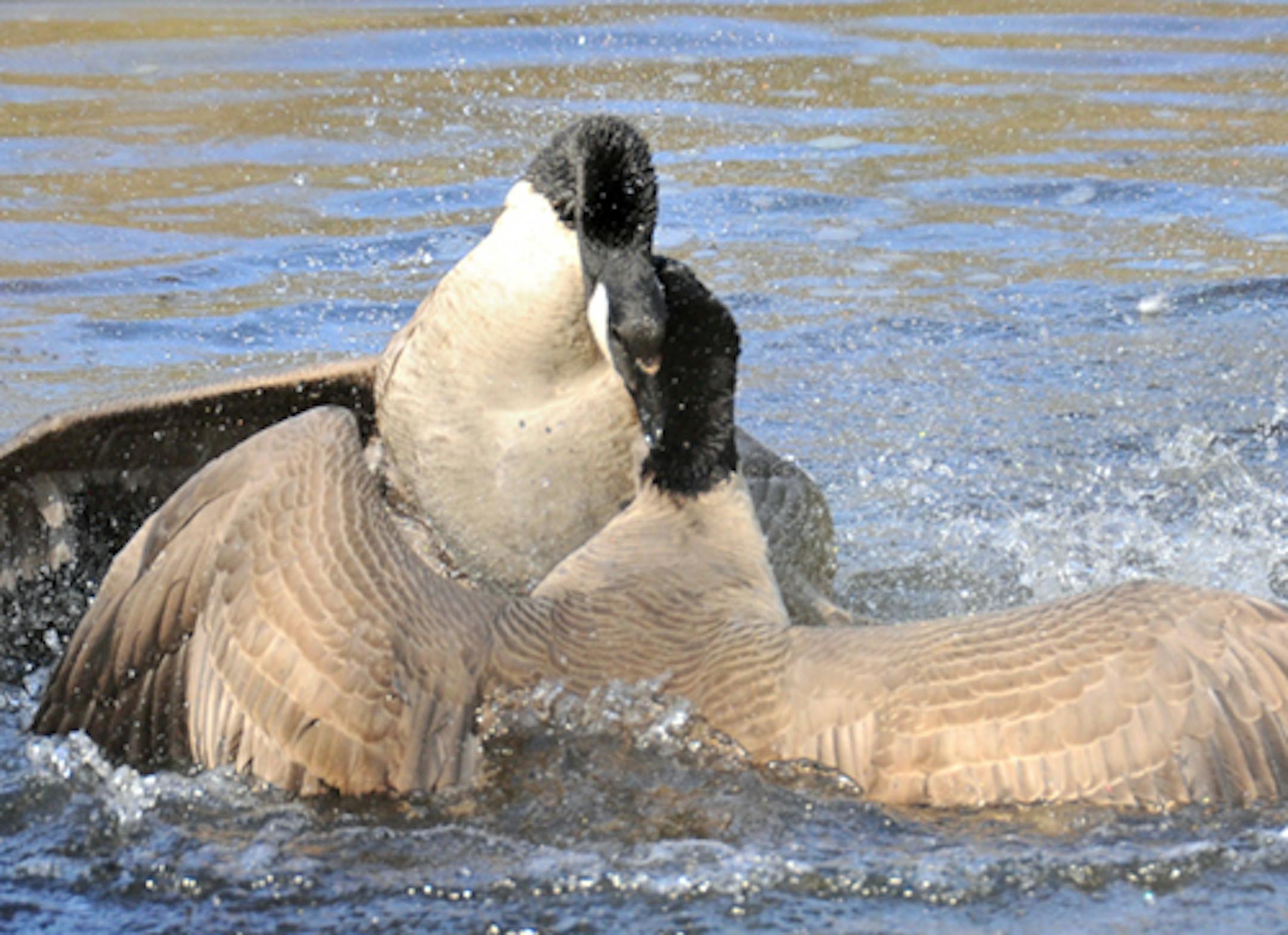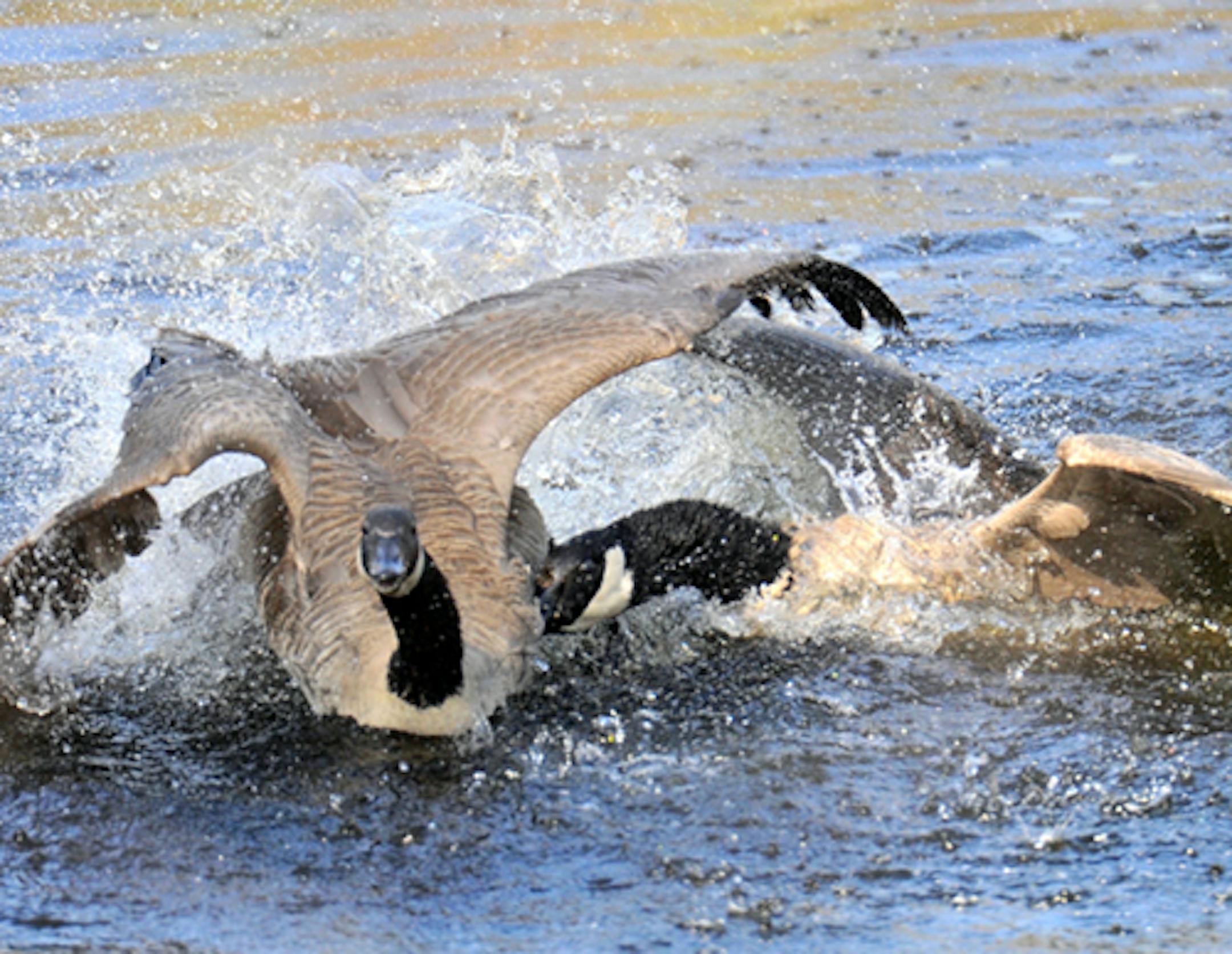 The pair of Canada geese nesting at the edge of our backyard pond are very territorial, as is the nature of that species. Occasionally, another goose or two land on the pond. The residents are quick to give chase, honking loudly, the intruders put to wing.