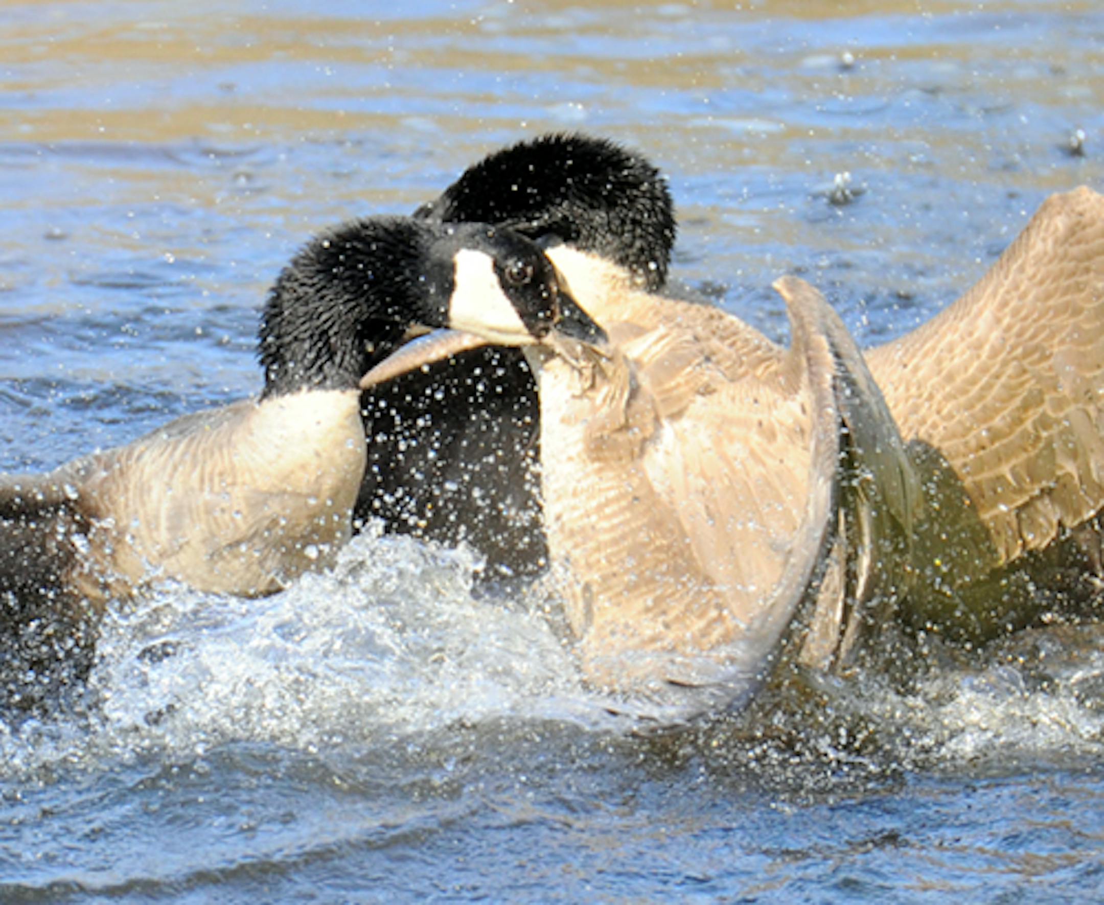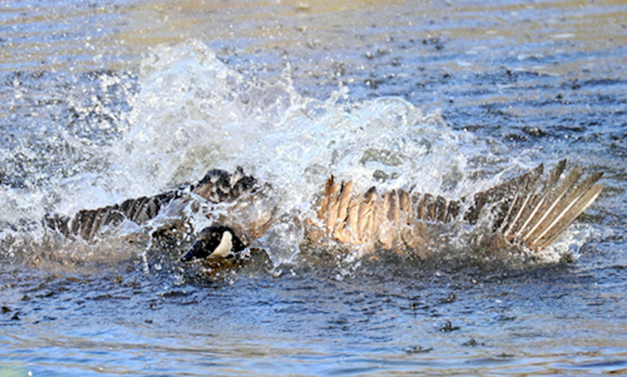 Yesterday, however, the resident gander got rough with what I assume to be the male of a pair that flew in. A wrestling match immediately ensued. Necks were grabbed and feathers pulled, the birds tumbling in great splashes of water, sometimes under water. The battle lasted about two minutes. The females watched until things calmed. The intruders left.