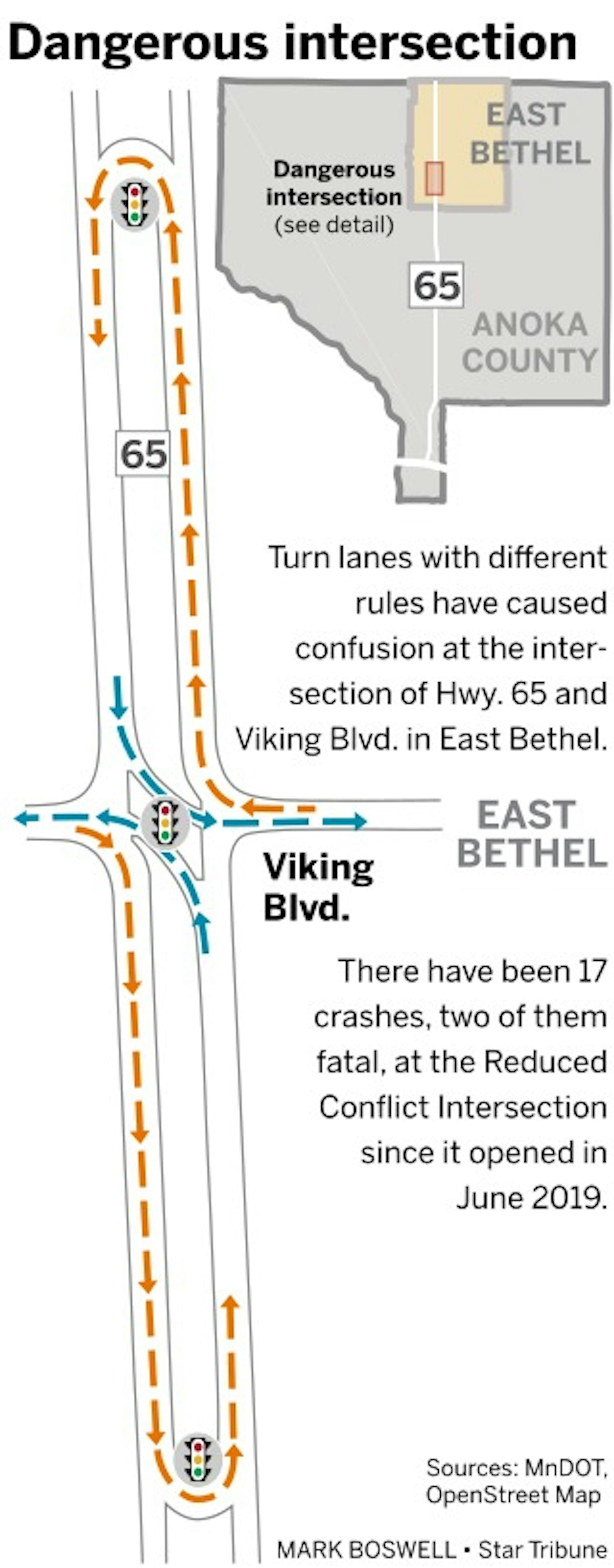 MnDOT installed the complex layout, called a Reduced Conflict Intersection, in 2019 to reduce cross traffic and crashes on the divided highway. Now, drivers from Viking can only make right turns onto Hwy. 65. If they want to go the other direction, or continue on the other side of Viking Boulevard, they must proceed to another stoplight on the highway and make a U-turn. But drivers are getting tripped up by the multiple turn lanes with different rules.