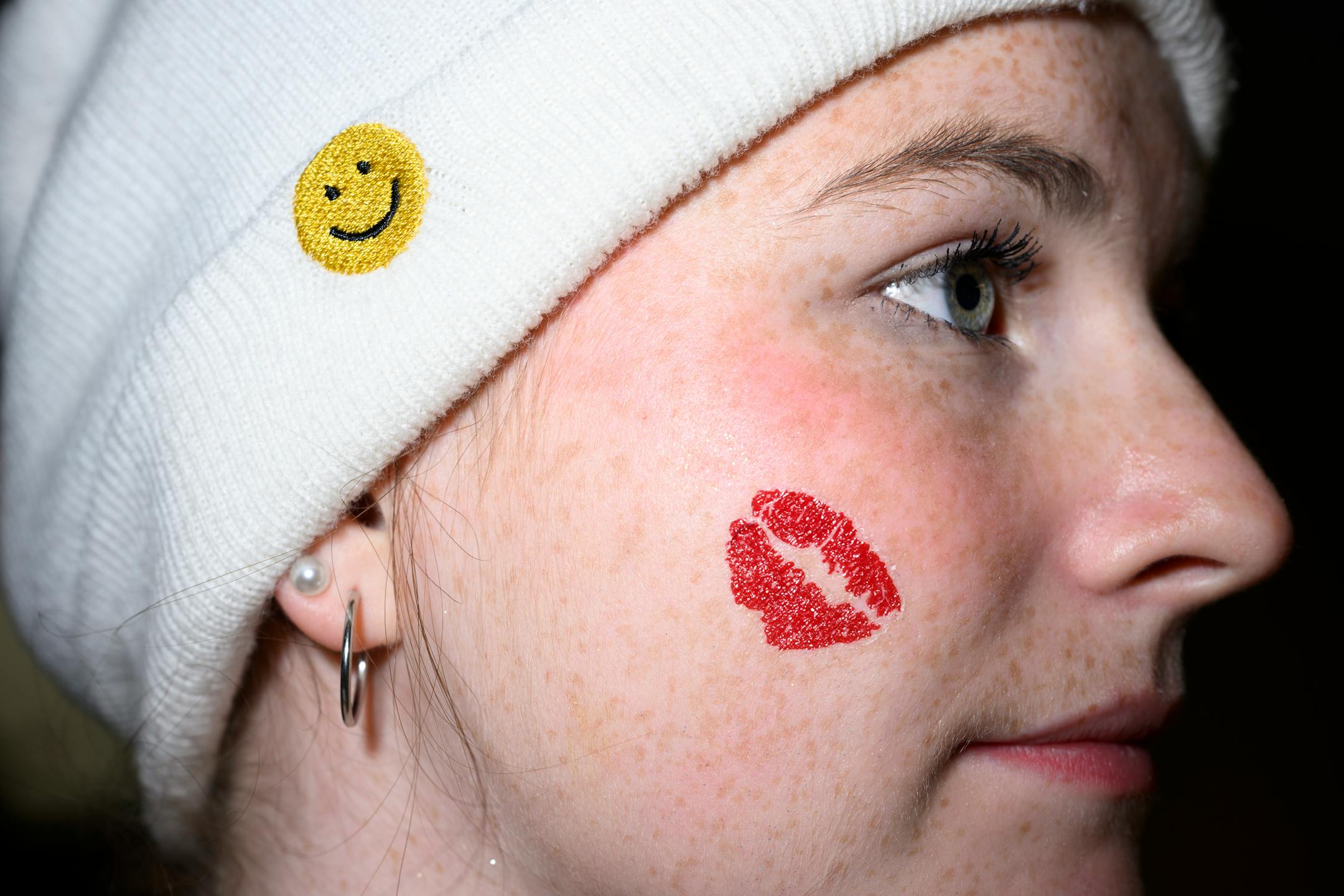 Marilyn Simonsen and Katie Kaufman posed in matching outfits: one with the word “Short” and the other with the word “Sweet” on their kiss-covered T-shirts, along with sequined silver skirts.