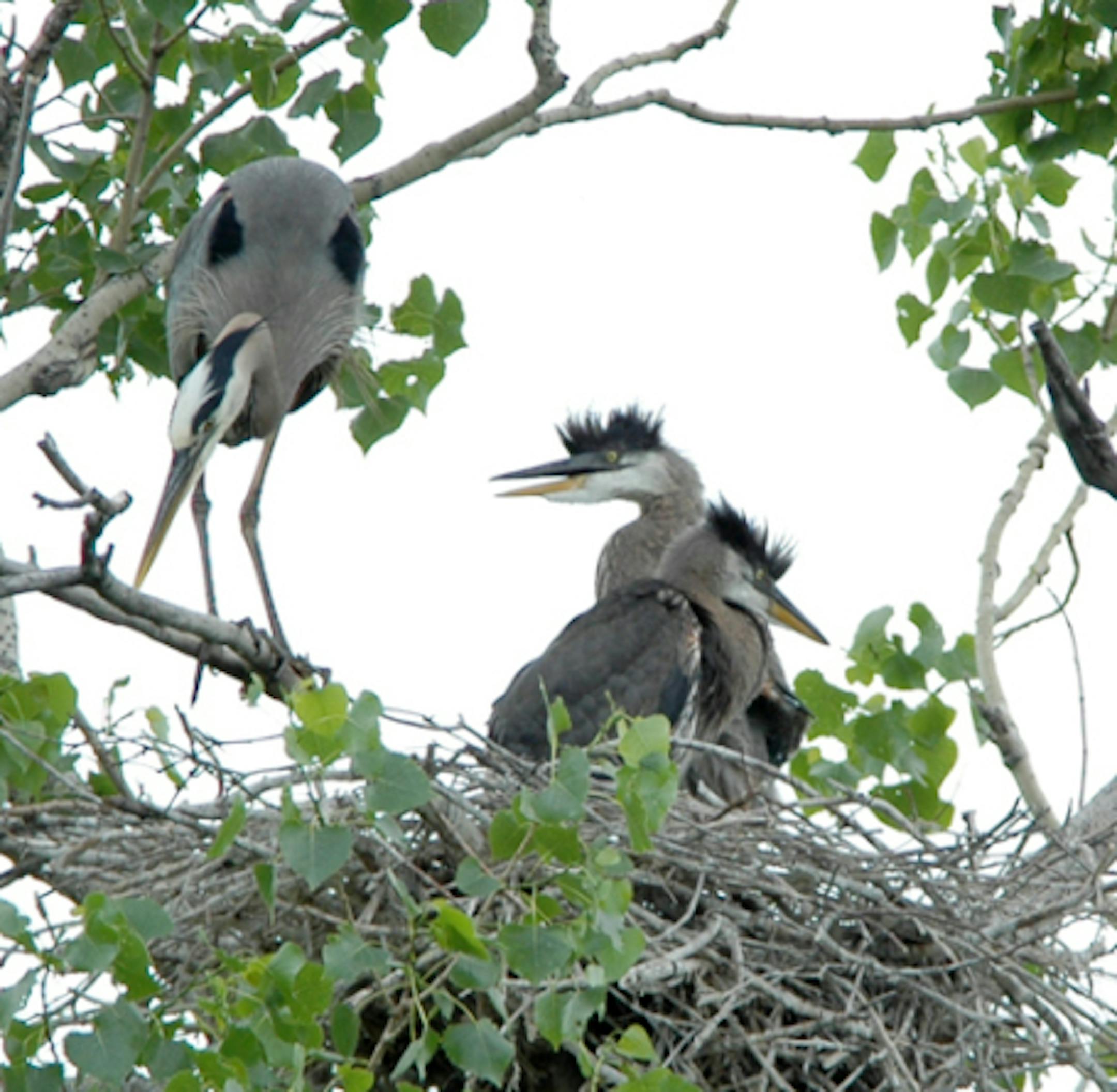 The Great Blue Heron rookery on an island in the river just off shore in the North Mississippi River Regional Park now contains somewhere near 80 half-grown herons plus their parents. The adults are busy feeding the rapidly growing young birds, some of their nests holding as many as four of the awkward-looking young birds. Foliage on island trees obscure many of the 30+ nests, but good sightlines are available for six or eight of the nests. They're readily visible from the paved park trails that run along the river shore. The park is accessed from the 49th Avenue exit on I-94 West, west of downtown Minneapolis perhaps six or seven minutes. The chicks are fed on an irregular schedule by their parents. It's worth the wait to see this. The parent heron sticks his/her bill down the throat of the chick and regurgitates stomach contents. Here is a photo of one nest taken Wednesday afternoon. The sun is behind you in the afternoon or early evening, so viewing is best then.