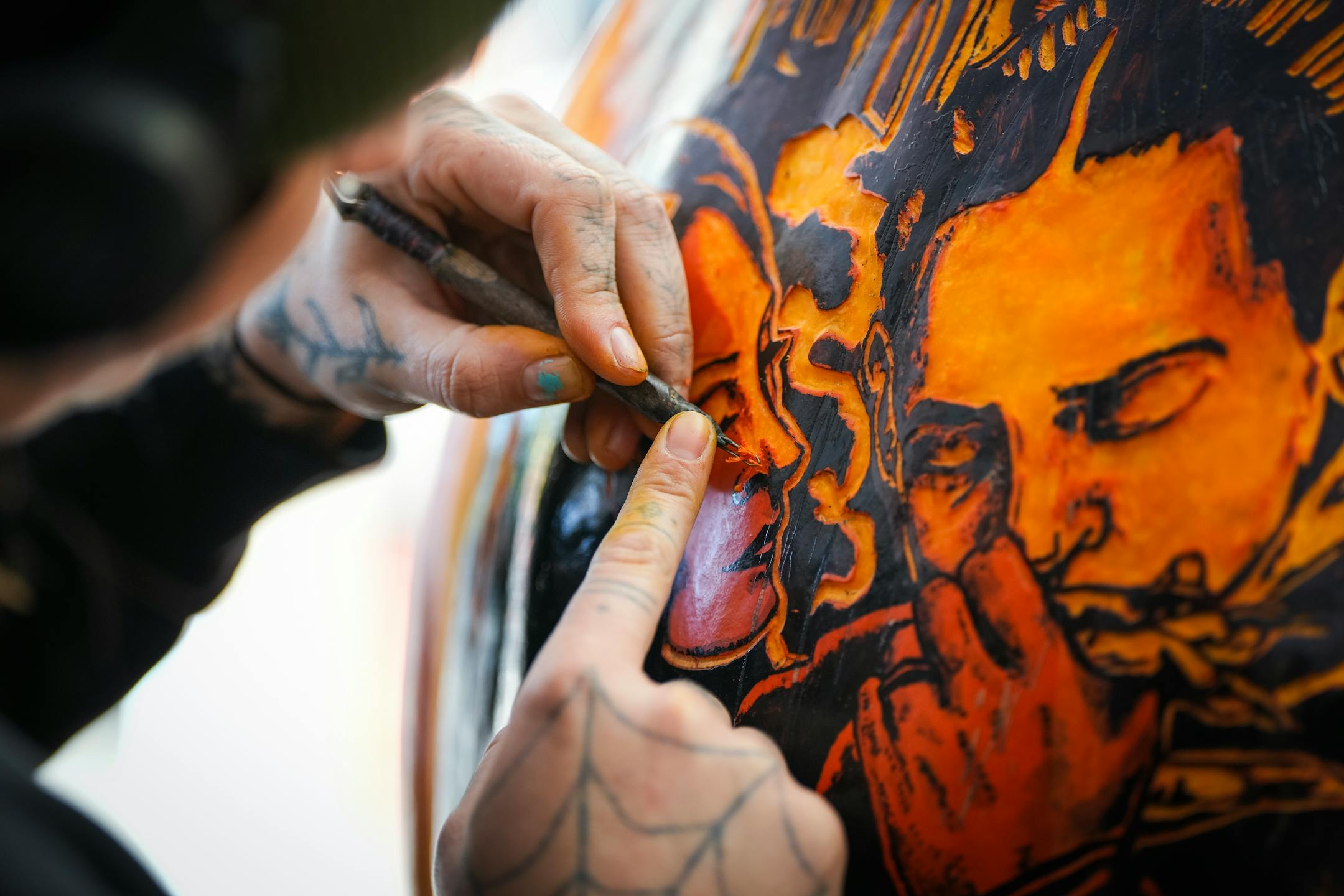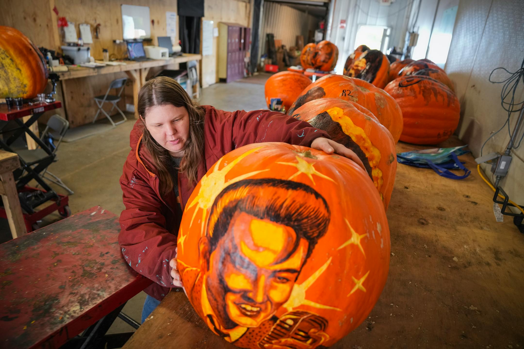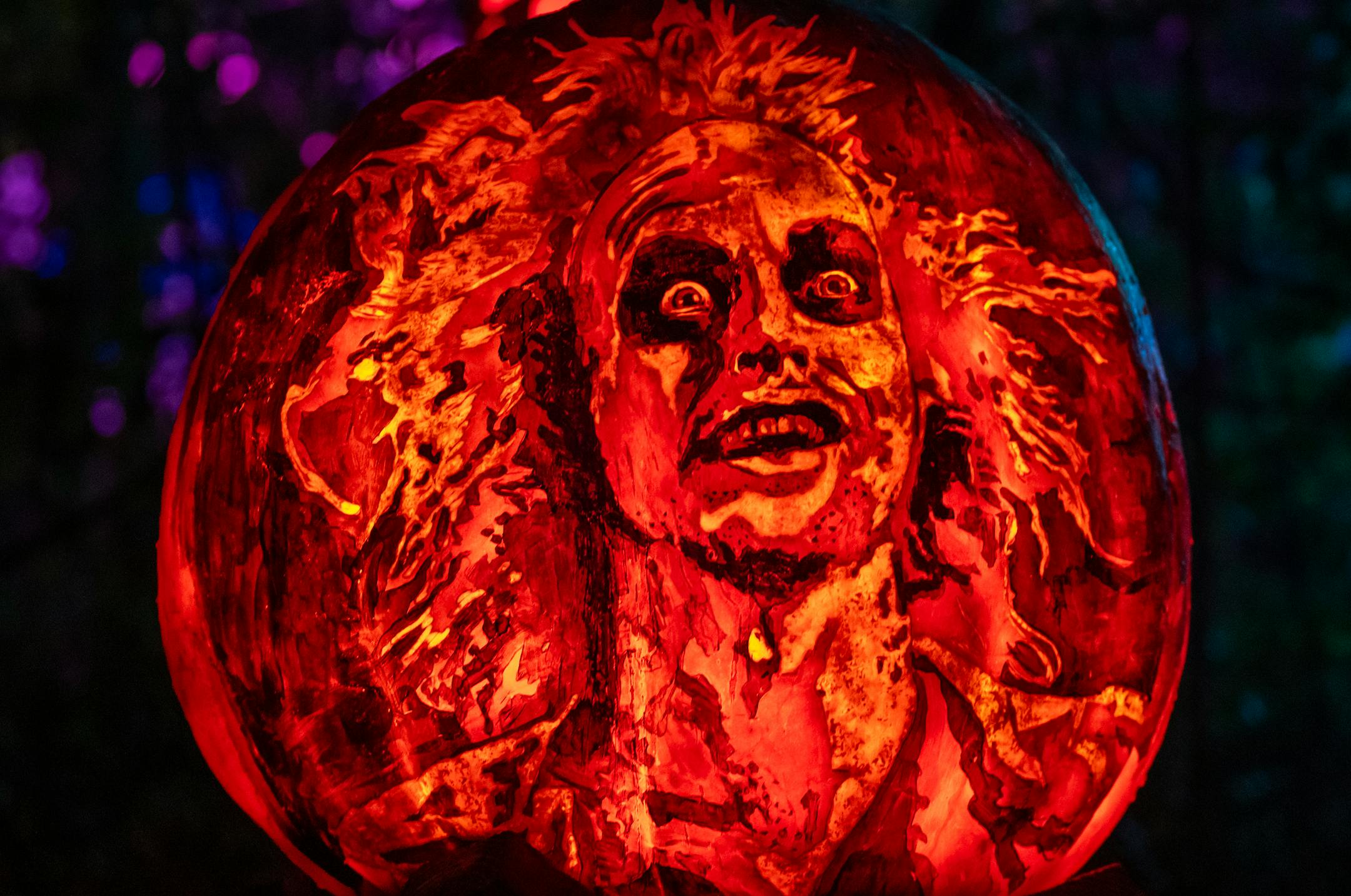 Big pumpkins take up to 20 hours to carve. They’re covered with intricate designs like skeleton versions of “The Simpsons” on a couch, a heavy metal collage, Prince, Vikings wide receiver Justin Jefferson and pop sensation Taylor Swift.