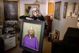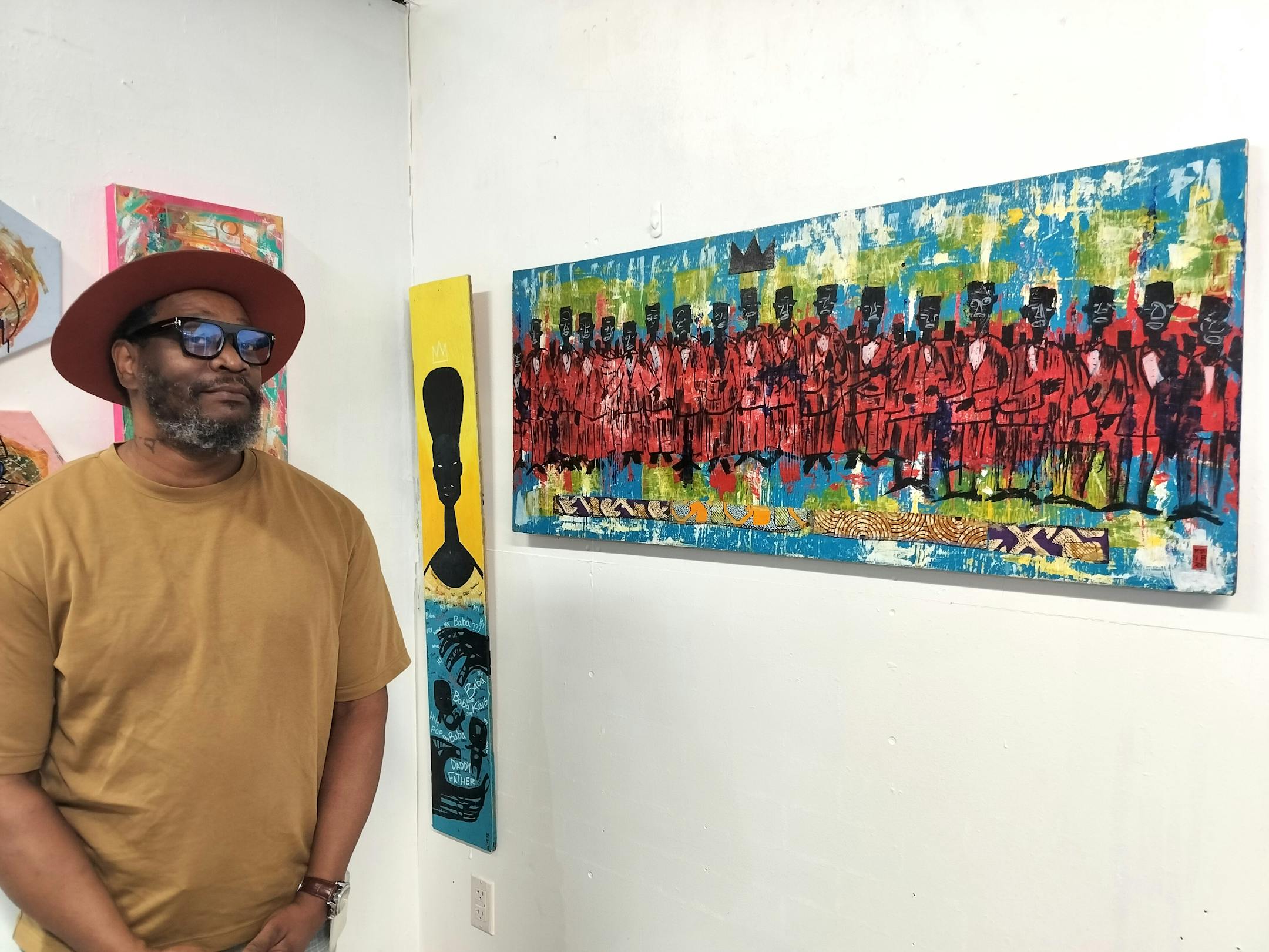 In the bustling Midtown Global Market on a weekday afternoon, while people browsed craft shops, sat at tables devouring lunch and got their hair done, artist-in-residence Ron Brown stood in the middle of his makeshift studio/gallery, admiring his array of paintings on wooden boards.