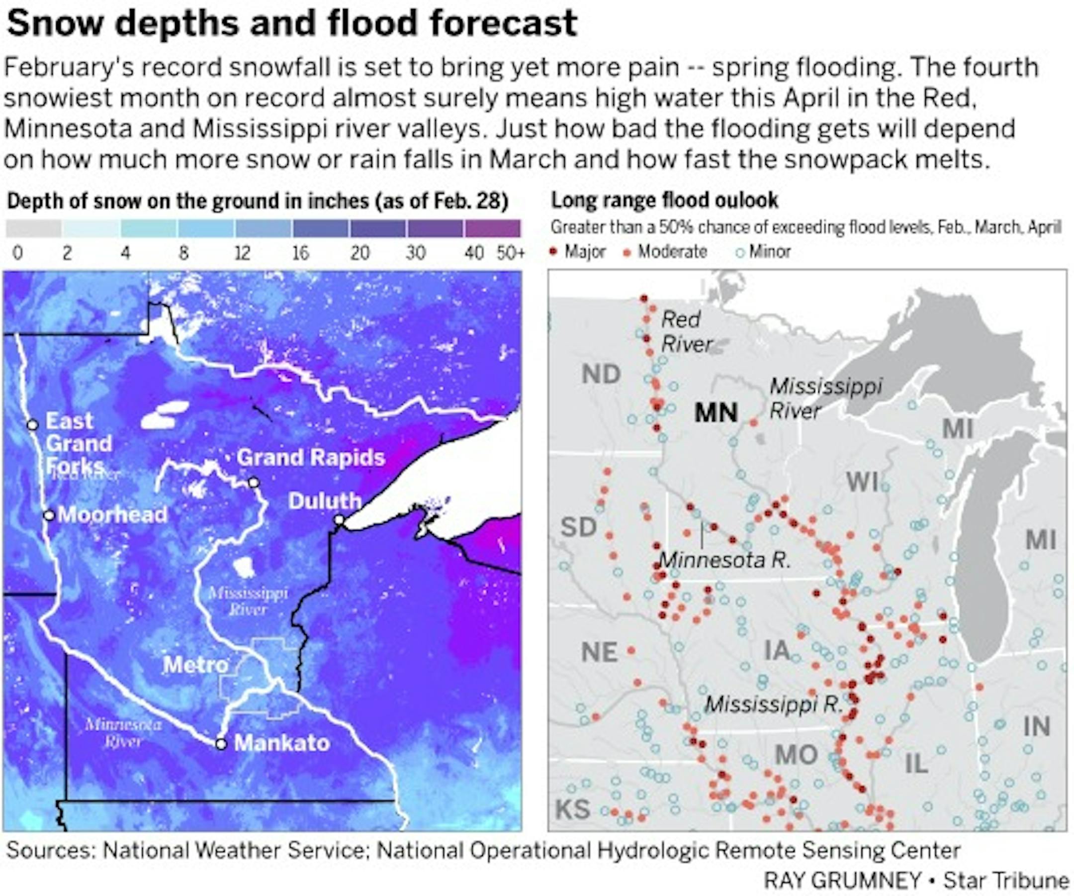 For those who watch flooding, the season took a turn in late January when cold and snow combined to rack up snow totals. In the Twin Cities, the 39 inches that fell last month made it the snowiest February on record.