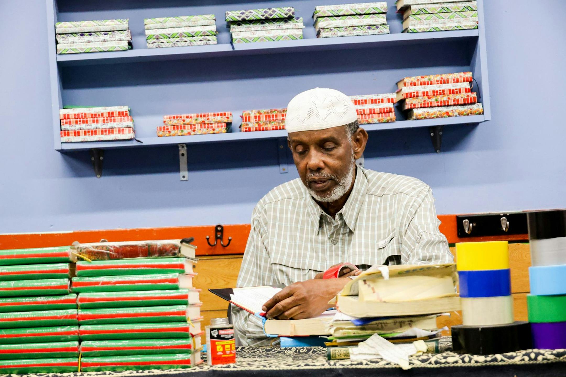 He’s one of three Somali men who volunteer as bookbinders at local mosques. But they haven’t been able to keep up with demand.