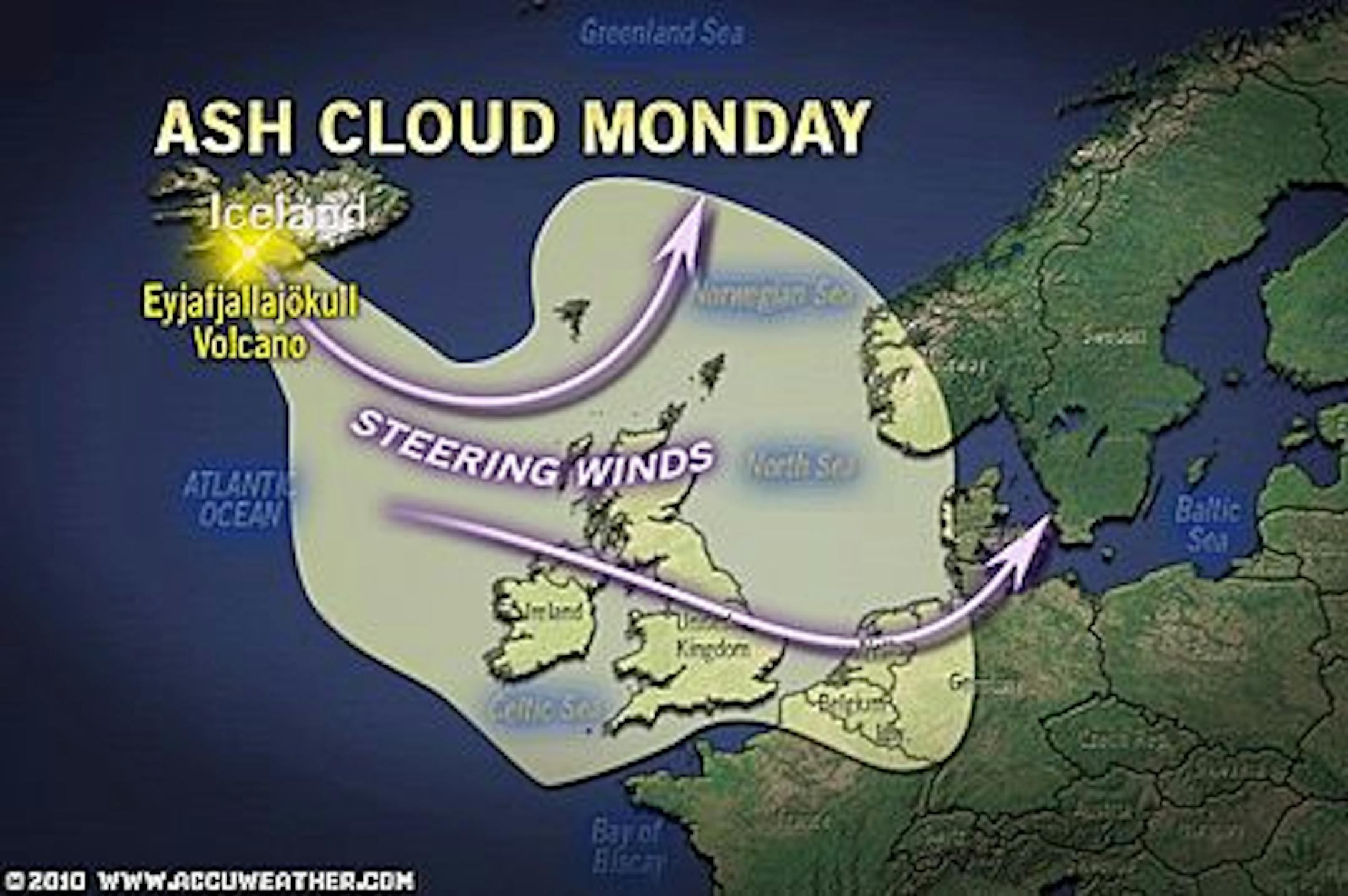 AccuWeather.com meteorologists said prevailing winds will continue carryingash across the UK and as far south as northern Germany and the Netherlandsthrough Monday.