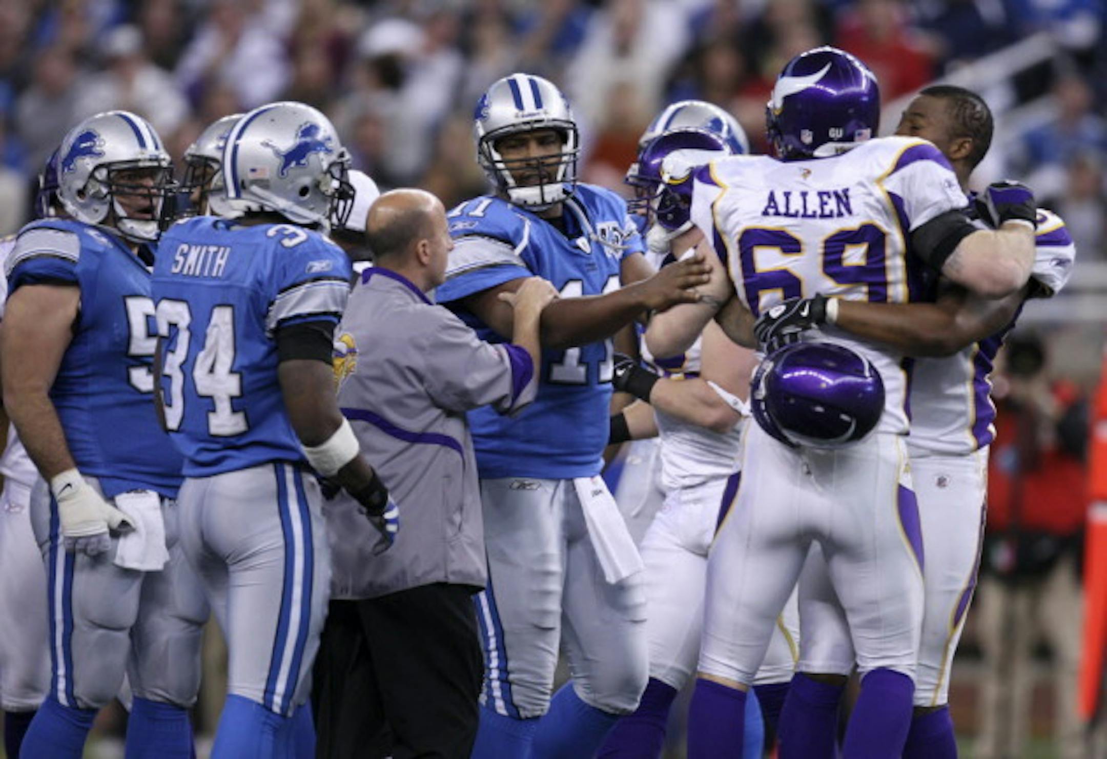 Allen referenced a fine levied against him in November 2008 for a hit on Houston quarterback Matt Schaub against a hit he took a month later against the Lions. "From my own experiences, I got fined $75,000 or something like that for hitting Schaub for what they said was low and he had the ball trying to get to him a few years back. I get knifed in the knee by a dude in Detroit, and they don't do anything."
